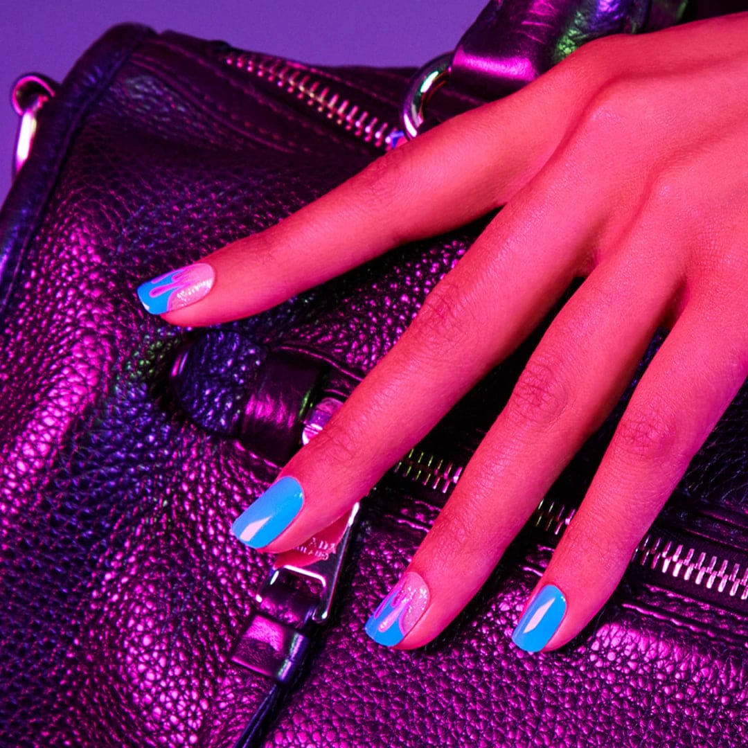 Sport the hottest manicure we’ve got if you’re looking to feel Bad and Blue-gie. Medium length, square shape, glossy finish electric blue press-on gel nails featuring flame accents with pink details.