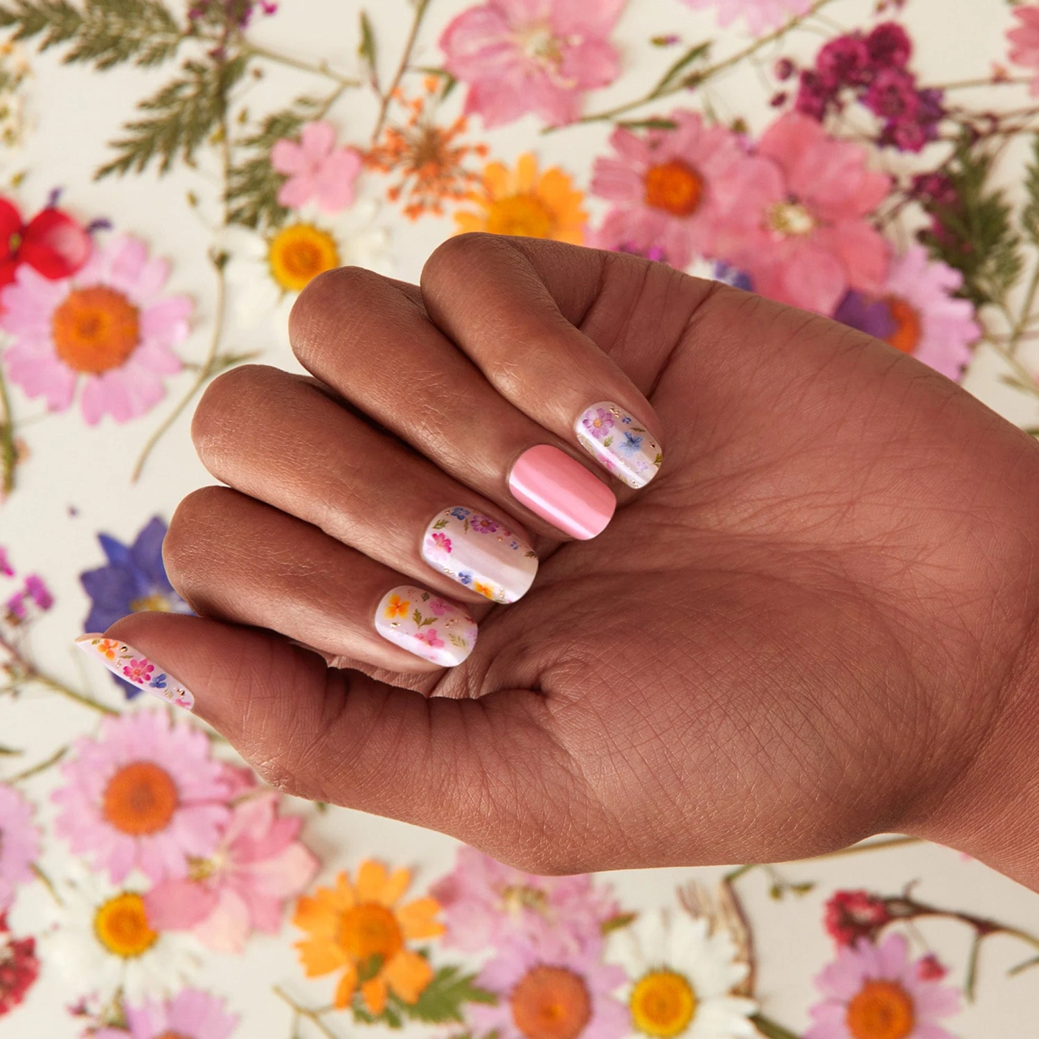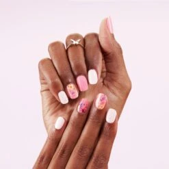 Peachy pink gel nail strips featuring vintage floral details with a double gel formula for an ultra smooth finish.