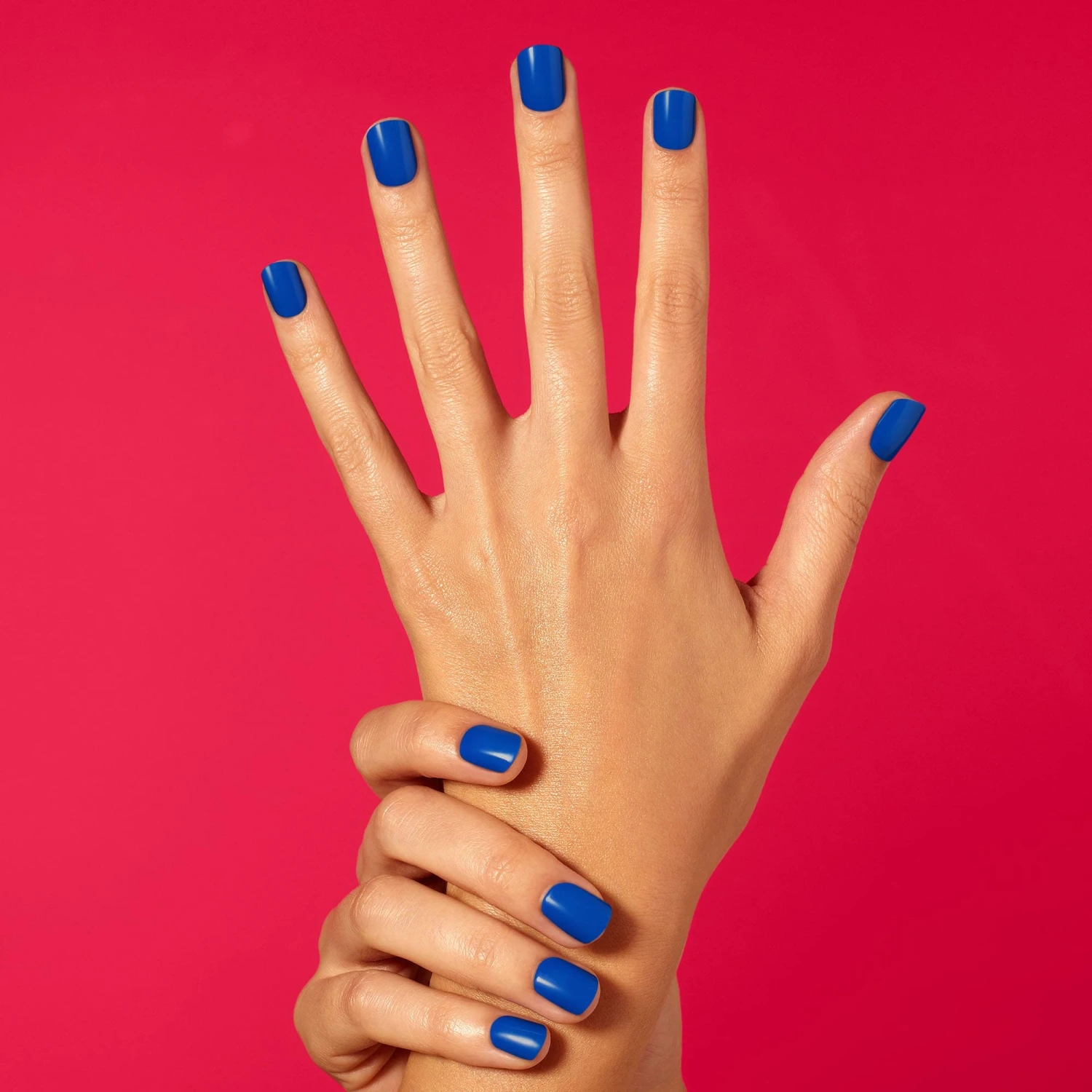 Short length, square shape, glossy finish press-on gel nails. Bright blue polish minus the paisley print.