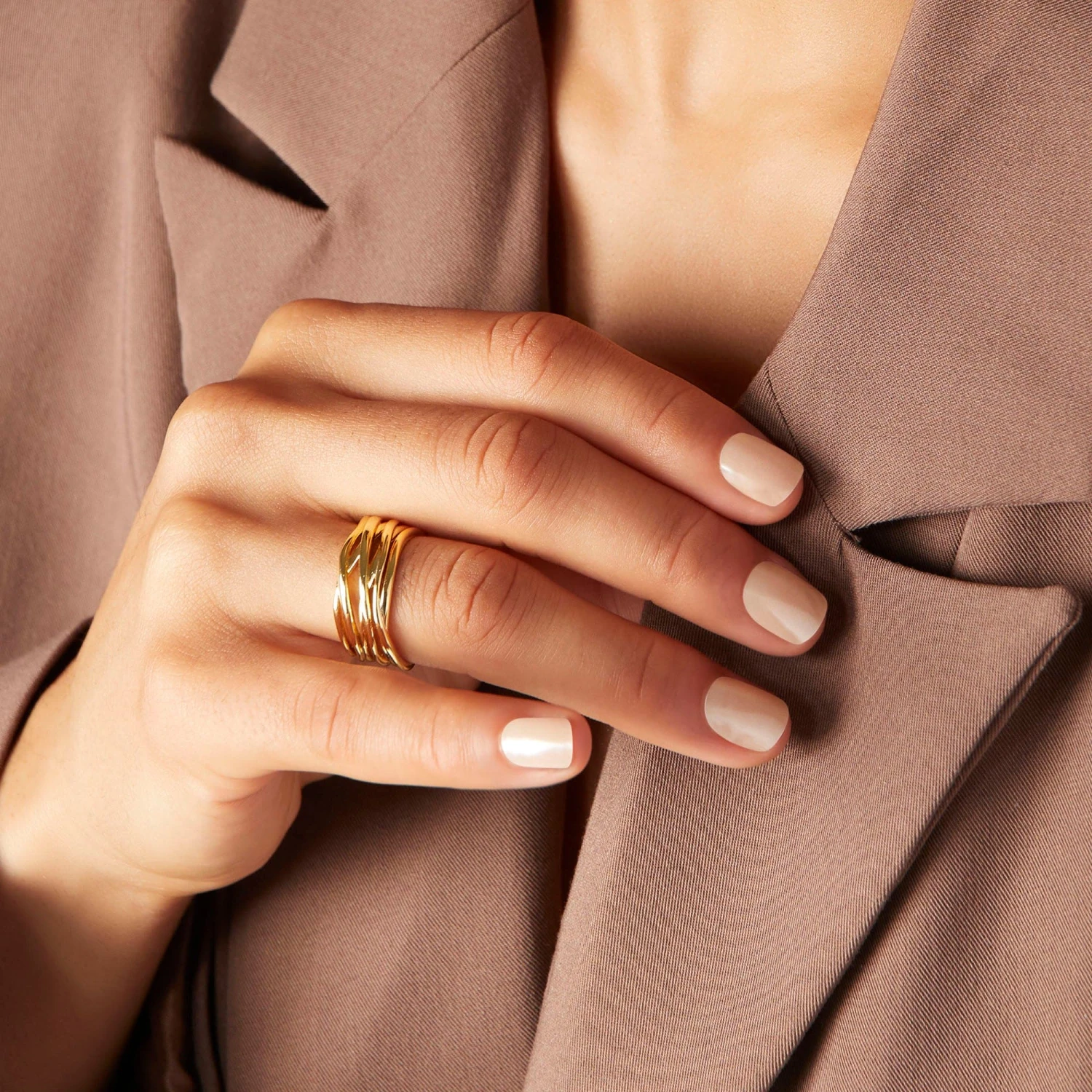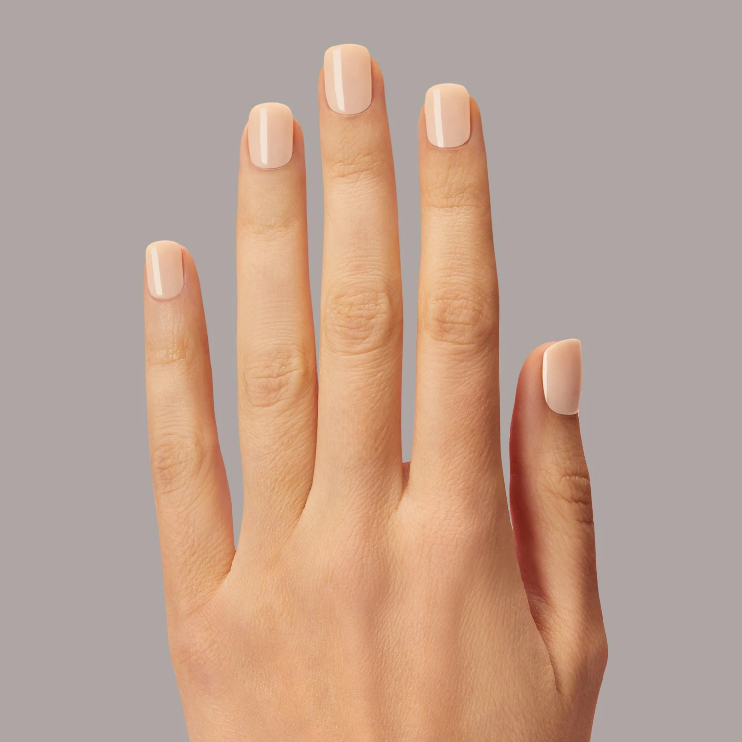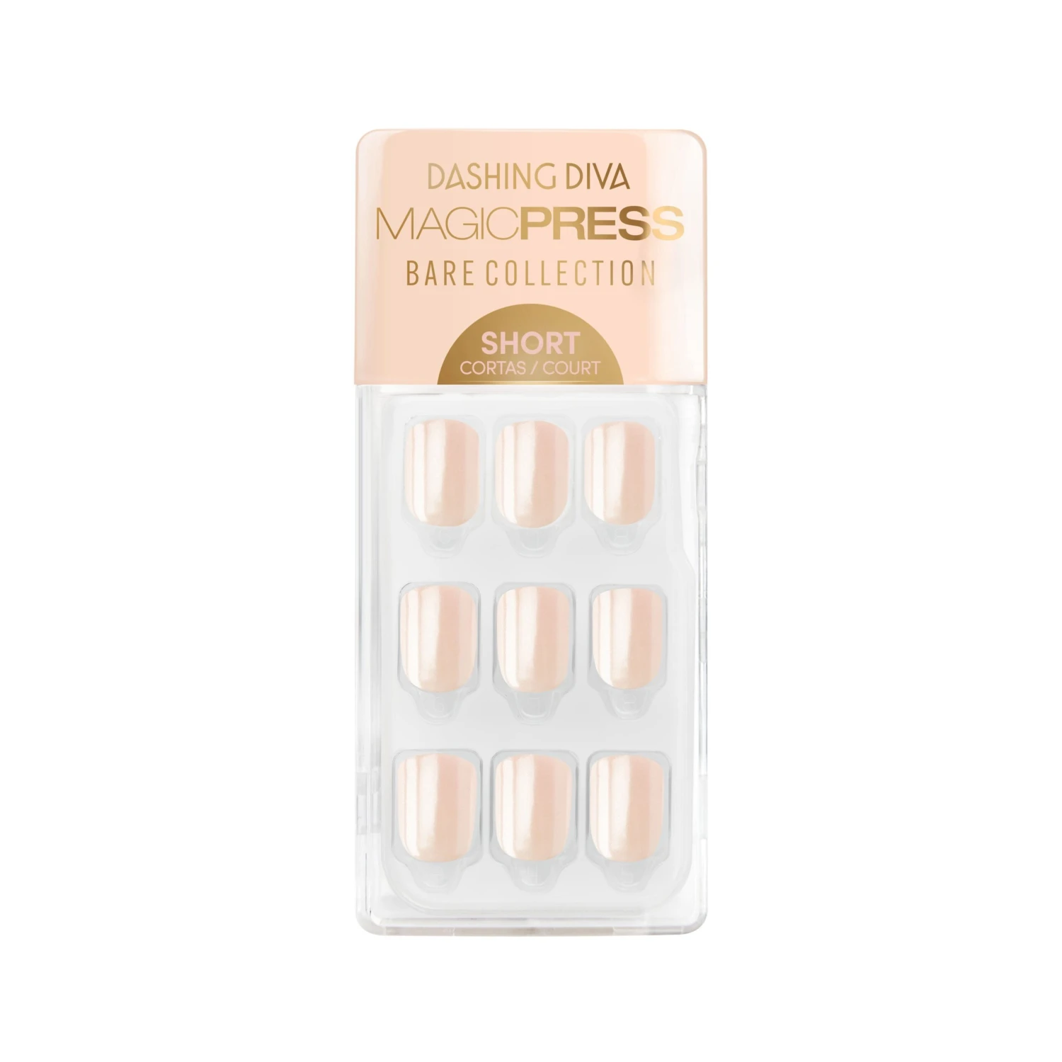 Short length, square shape, light nude-pink press-on gel nails featuring a glossy, shimmery chrome finish.