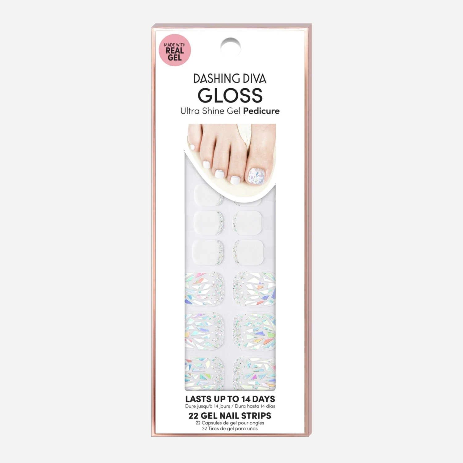 Beachcombers, look no more – We’ve found your treasure and its beauty is priceless! Translucent gel pedicure strips featuring silver glitter french tips & holographic shattered glass accents with a glossy, high-shine finish.