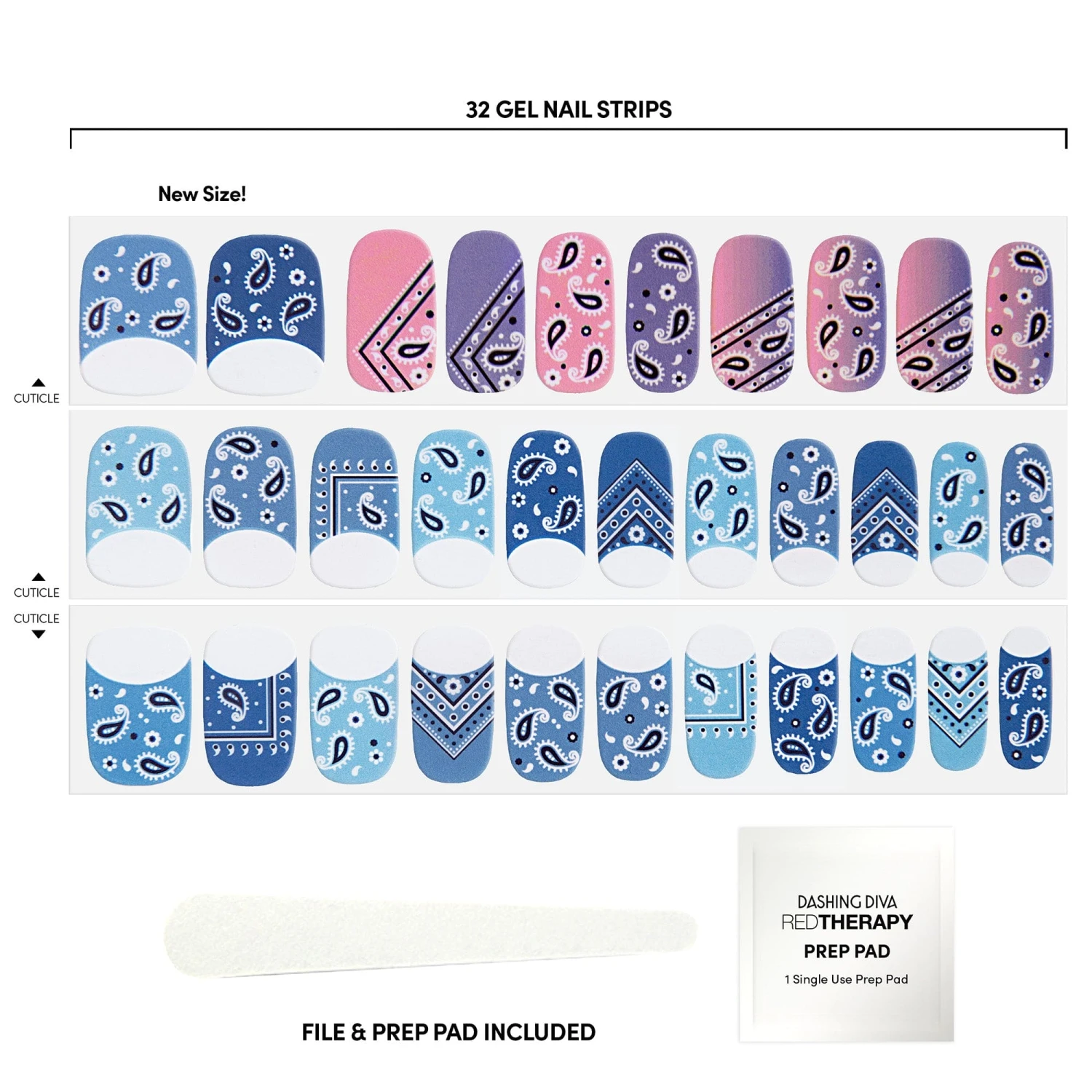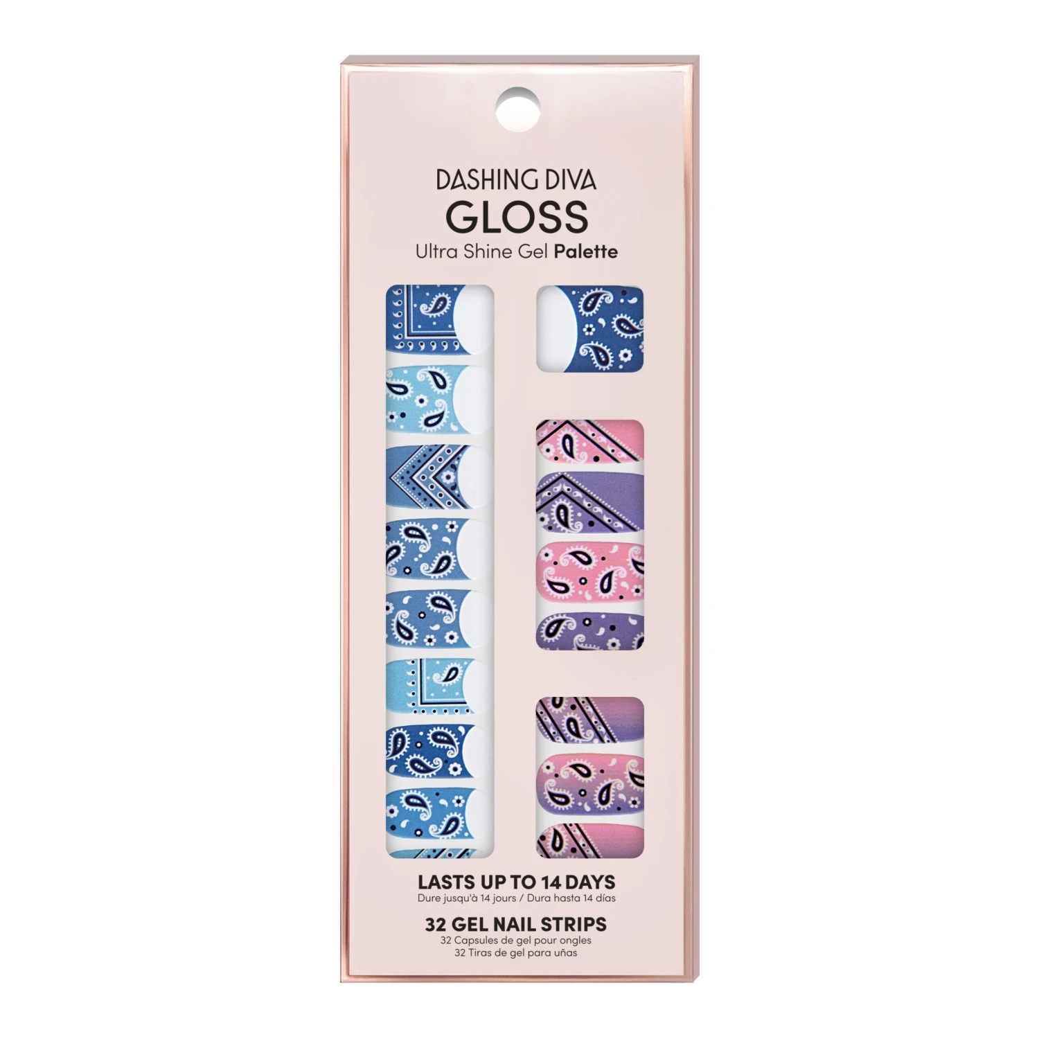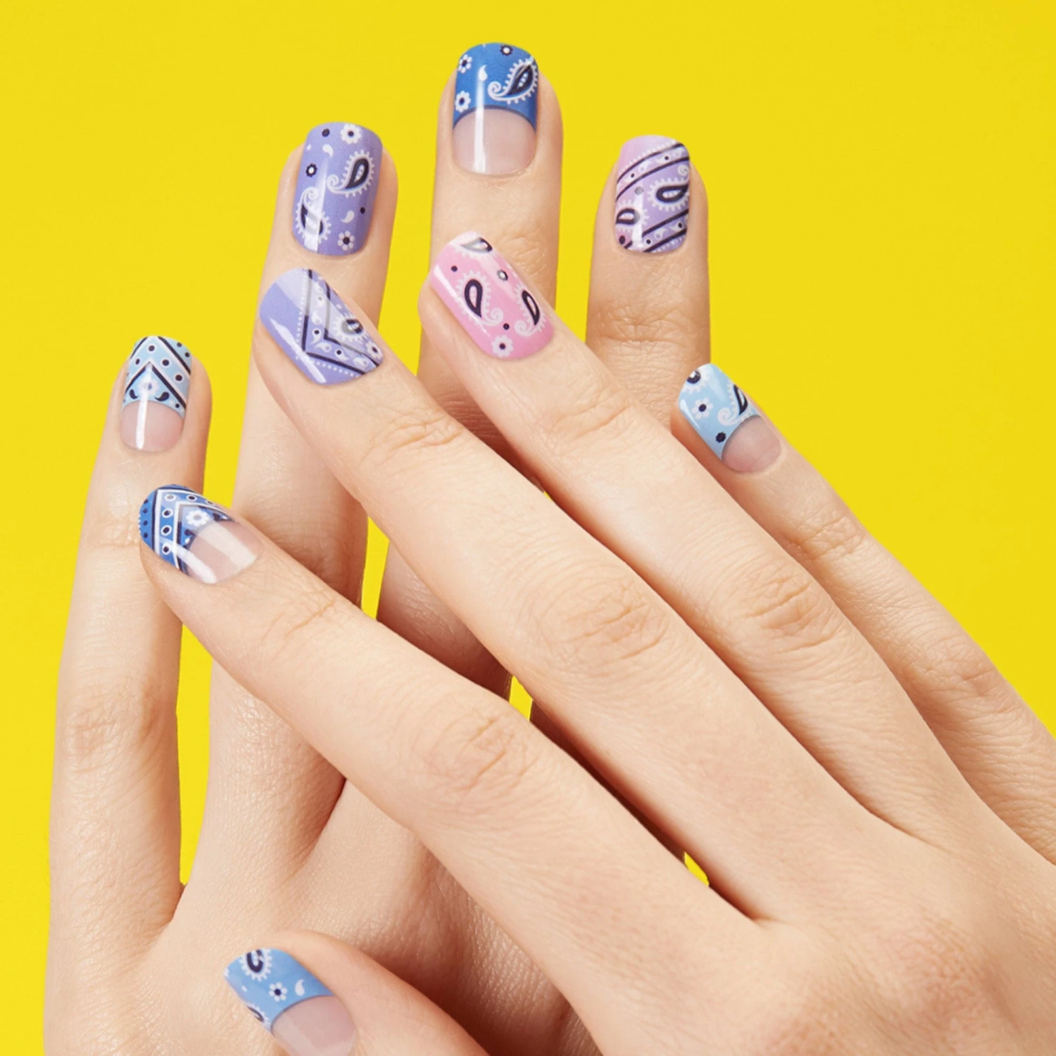Dark wash or light wash? Monochromatic blue bandana print French tips featuring gradient pink to purple accents with a glossy, high-shine finish.