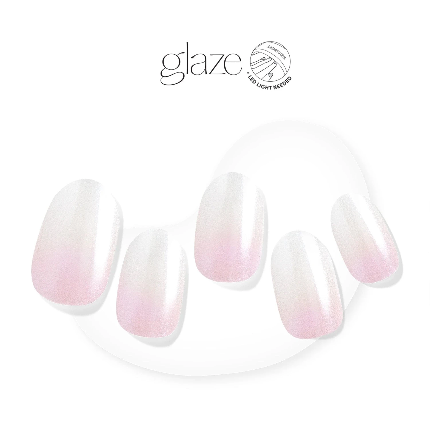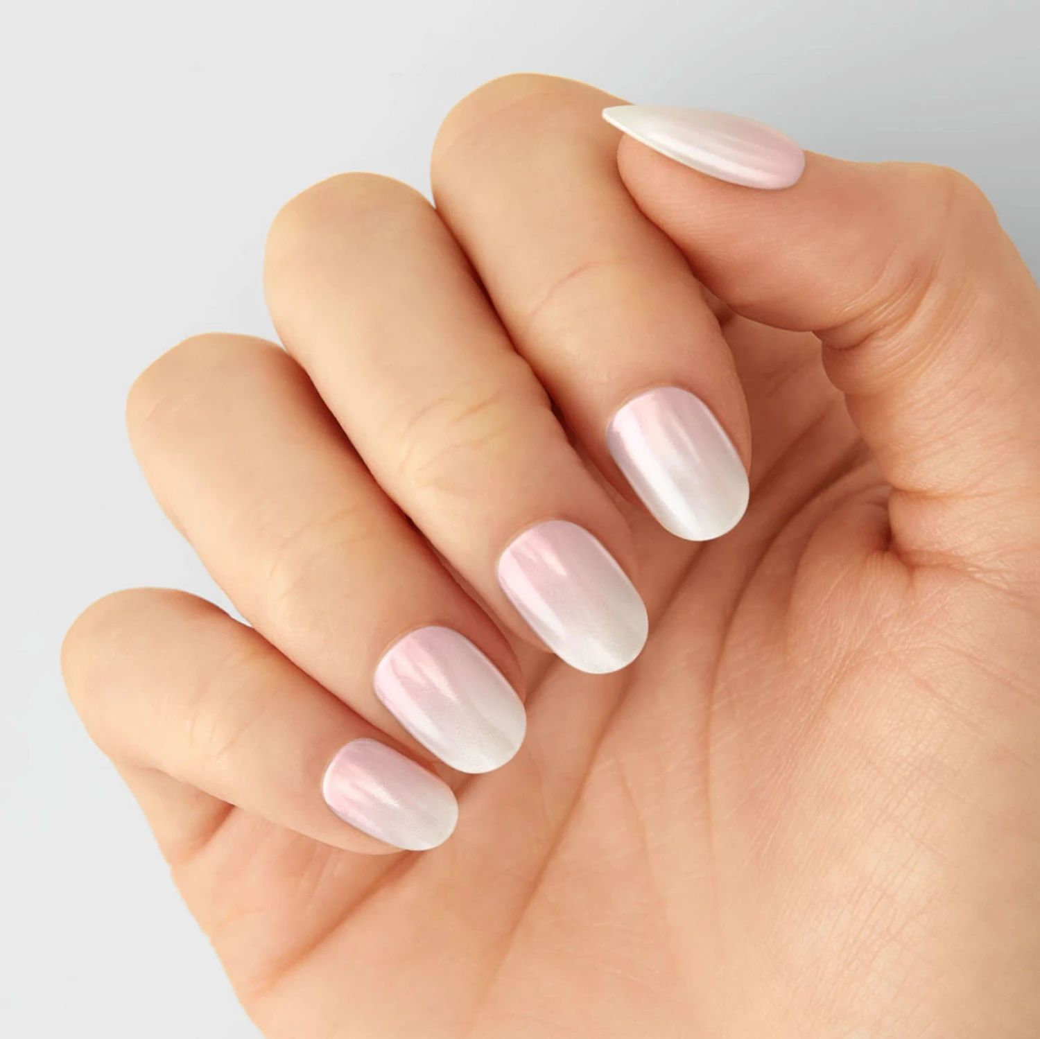 Semi-cured pink-to-white gradient gel nail strips featuring a shimmery chrome finish with mega volume & maximum shine.