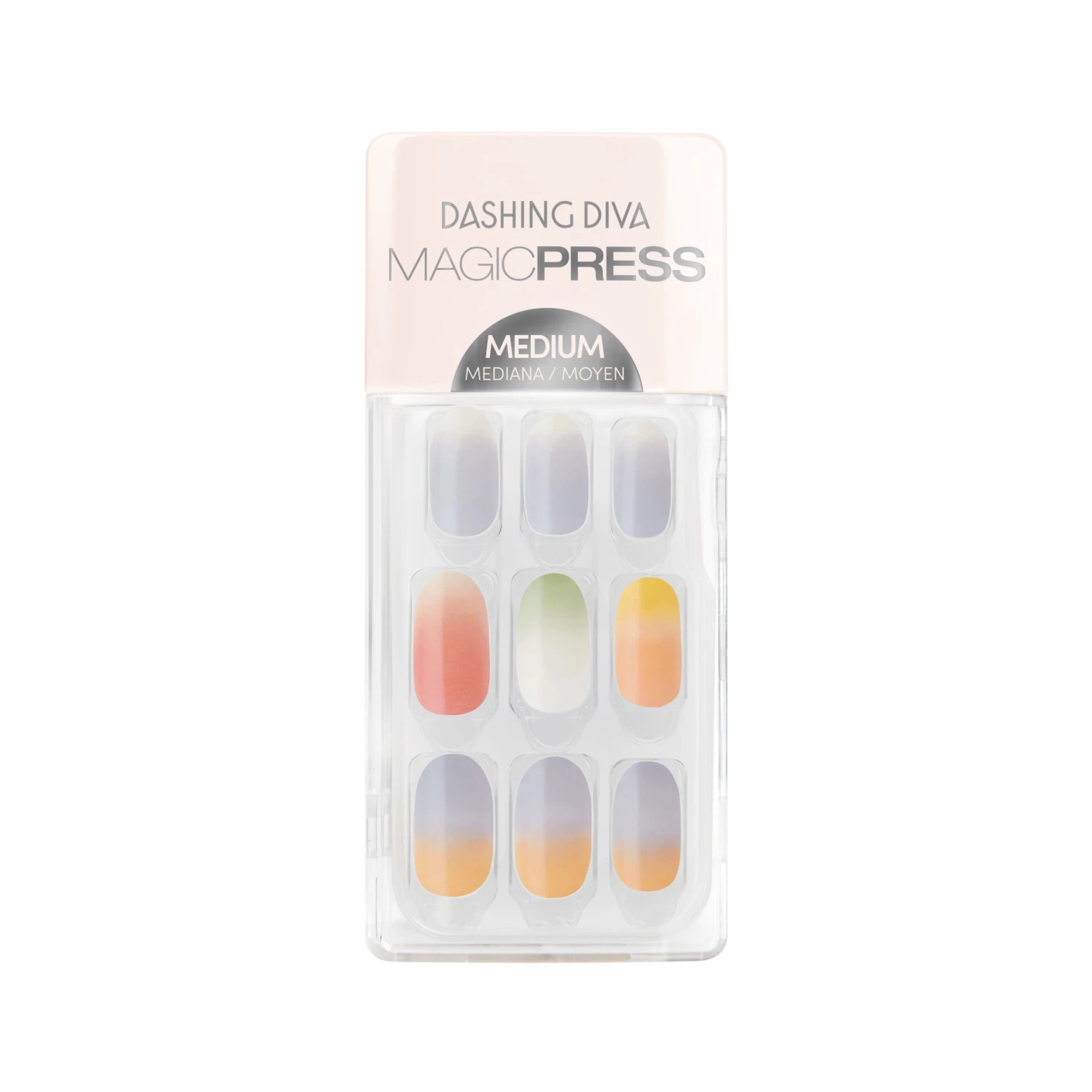 You can tone down the color, just don’t tone down the music! Medium length, oval shape, glossy finish press-on gel nails featuring multicolored ombré effects.