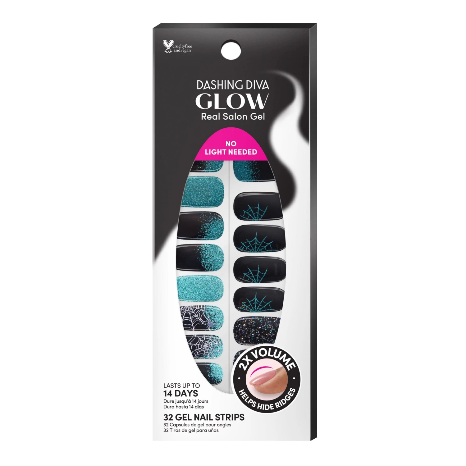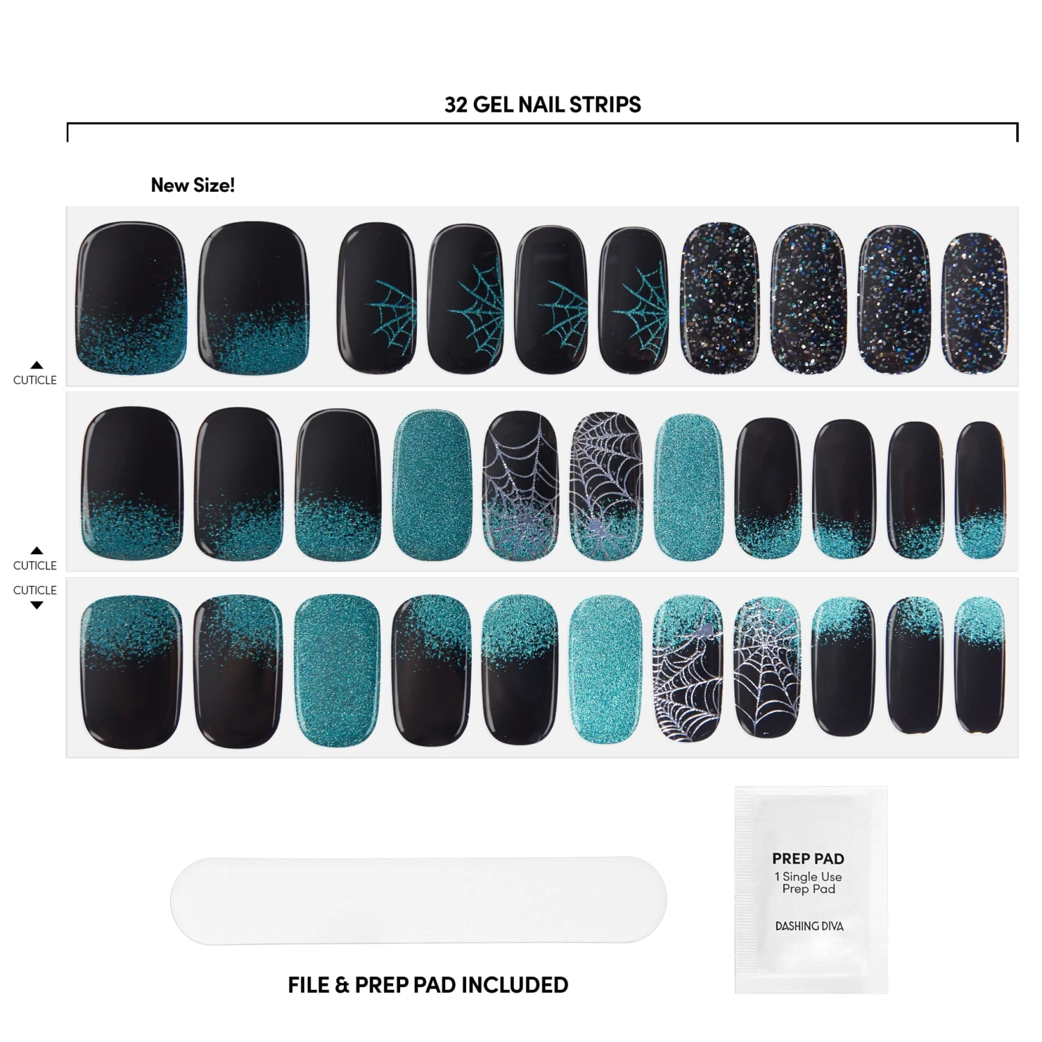 Black gel nail strips featuring green shimmery chrome, iridescent glitter, and silver foil spiderwebs with a double gel formula for an ultra-smooth finish.