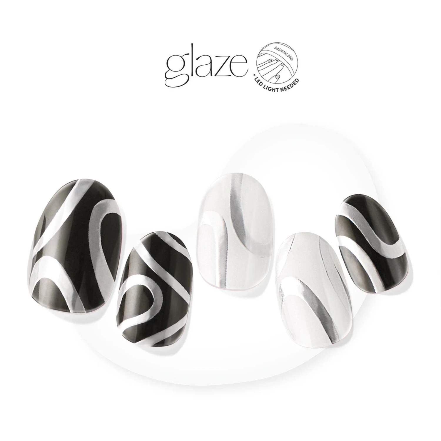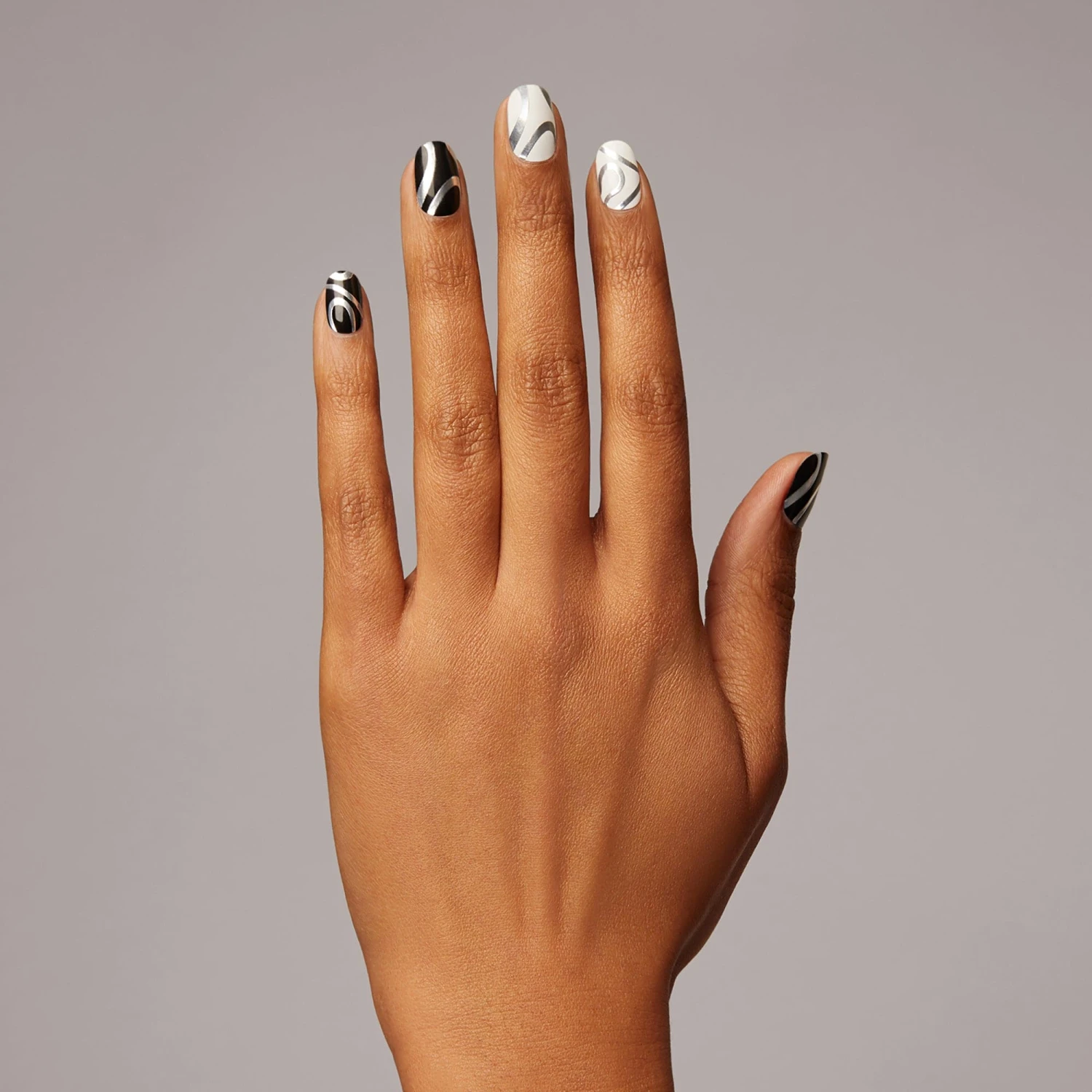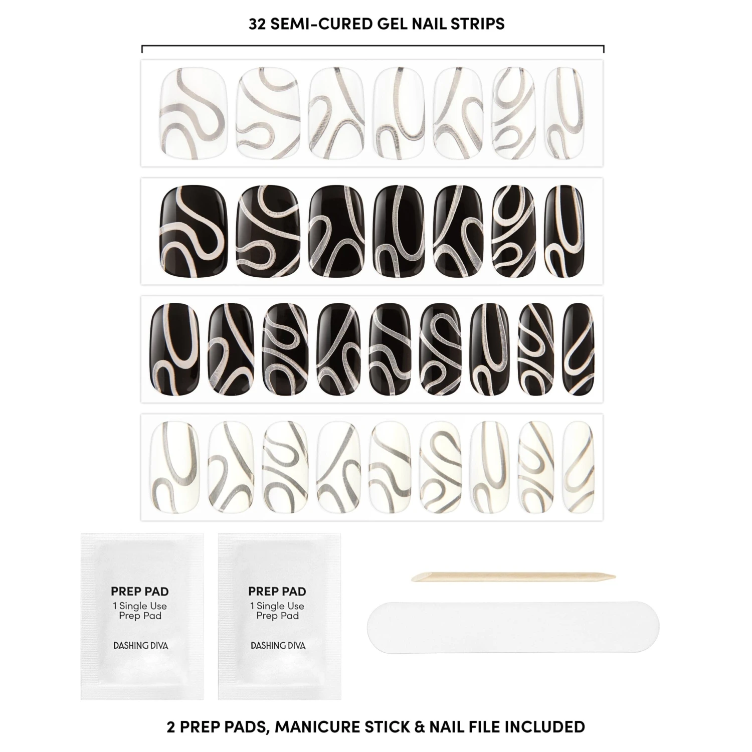 Semi-cured black & white gel nail strips featuring silver foil line art with mega volume & maximum shine.