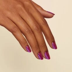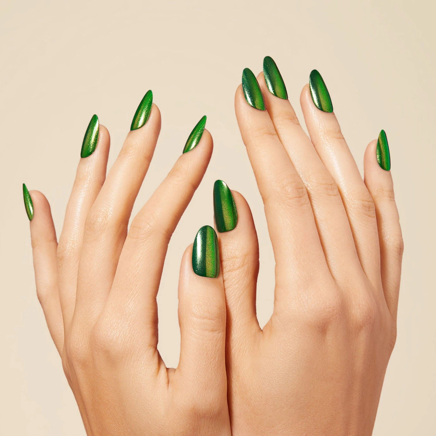 Green press-on gel nails featuring a medium length, almond shape, and a metallic chrome finish.