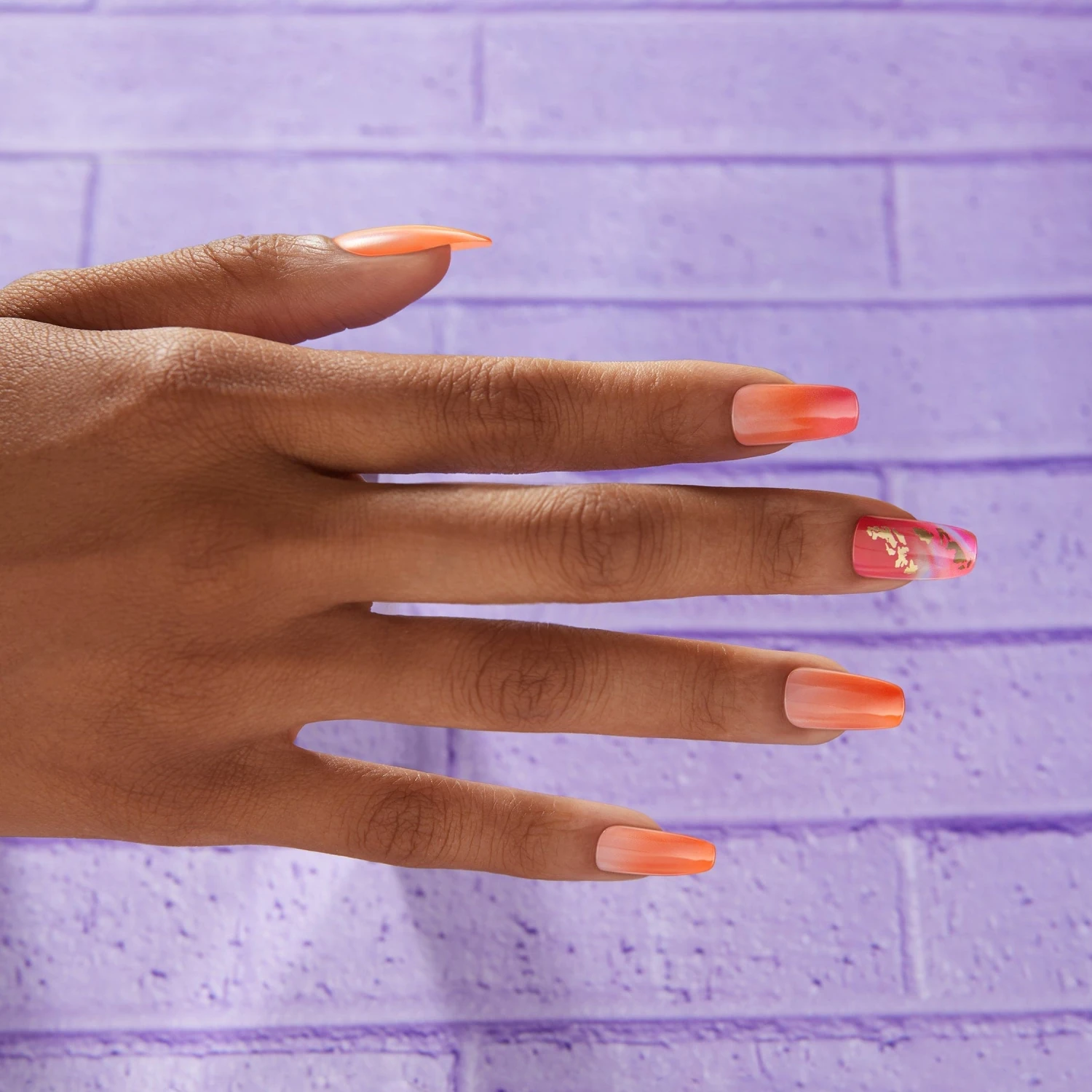 An orangish, reddish sensation. Get an instant energy boost with this bright sunset manicure.