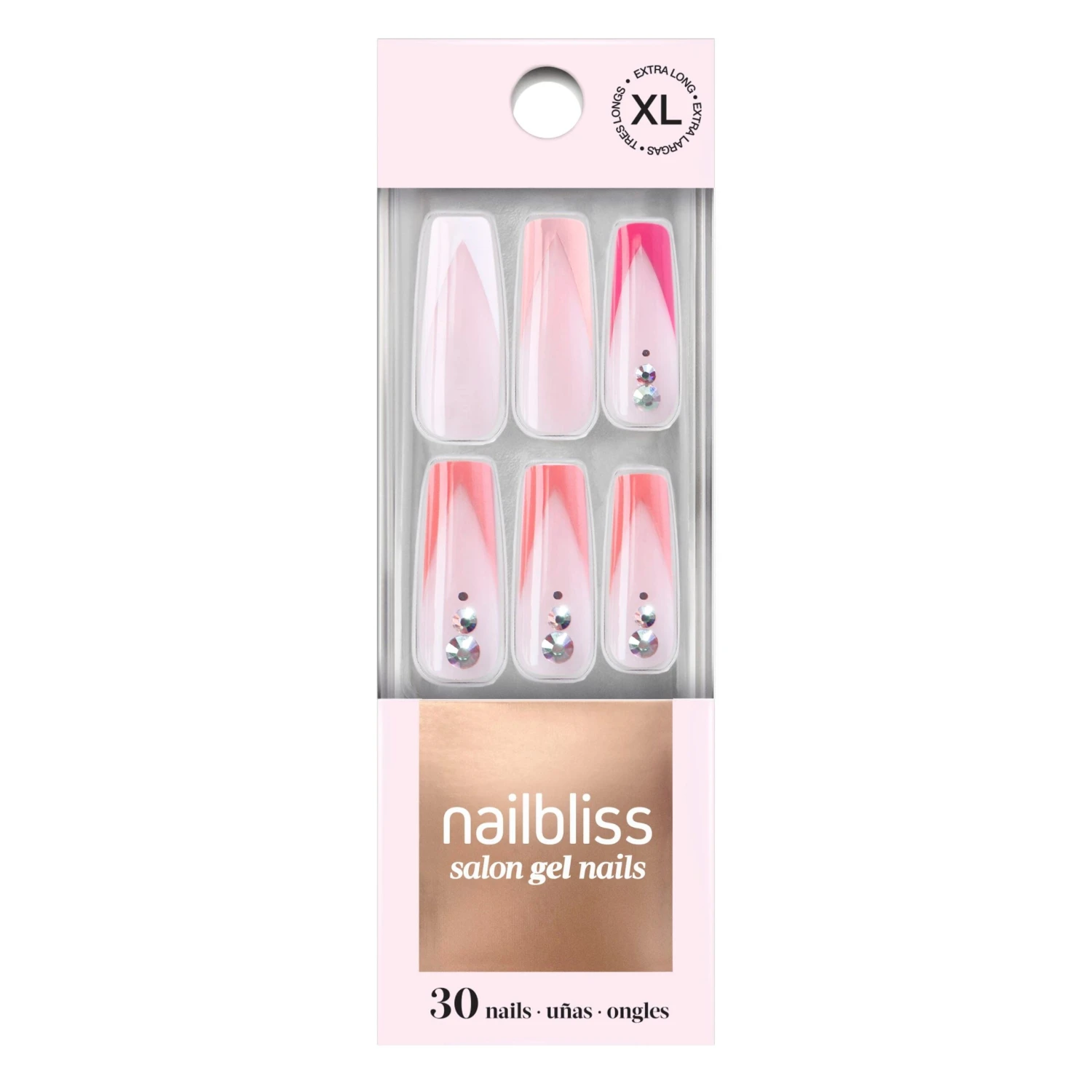 Extra long length, square shape, glossy finish. Sheer, nude pink glue-on gel nails featuring magenta, peach, light pink, and white chevron french tips and iridescent rhinestones.