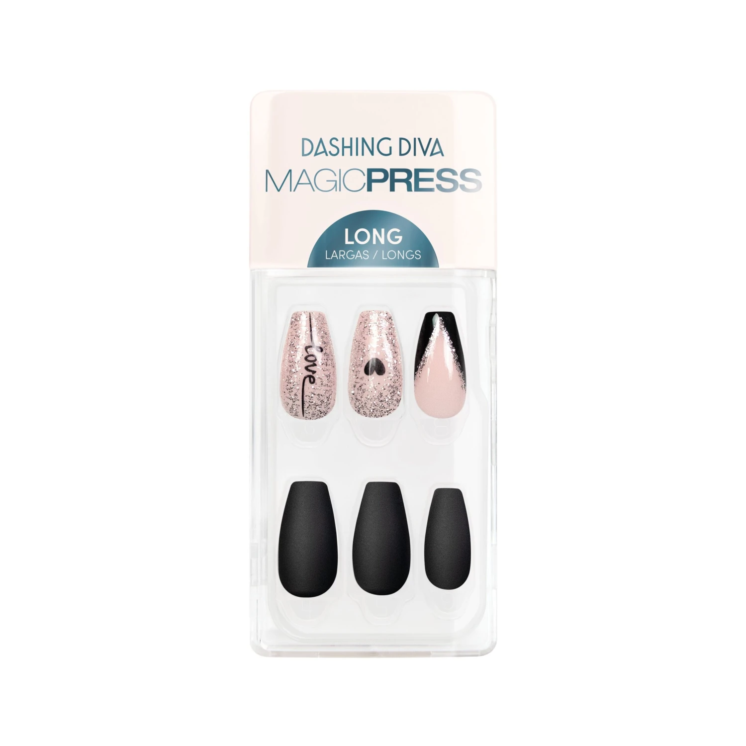 Long length, coffin shape, glossy finish black, and nude press-on nails. Featuring silver glitter and cursive love letters.