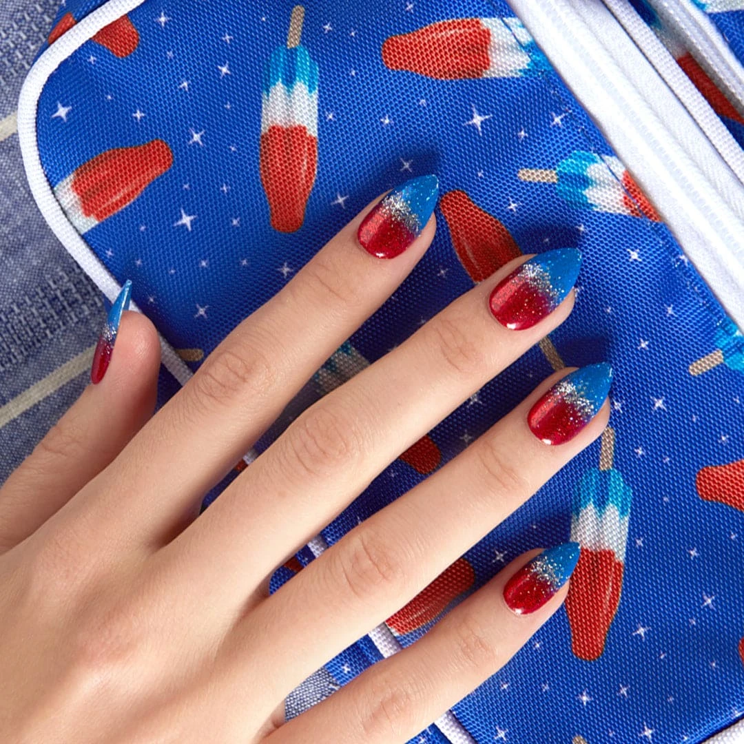 Free your inner diva by sparkling all night in this fun, festive manicure. Long length, stiletto shape, glossy finish red & blue press-on gel nails featuring silver glitter.