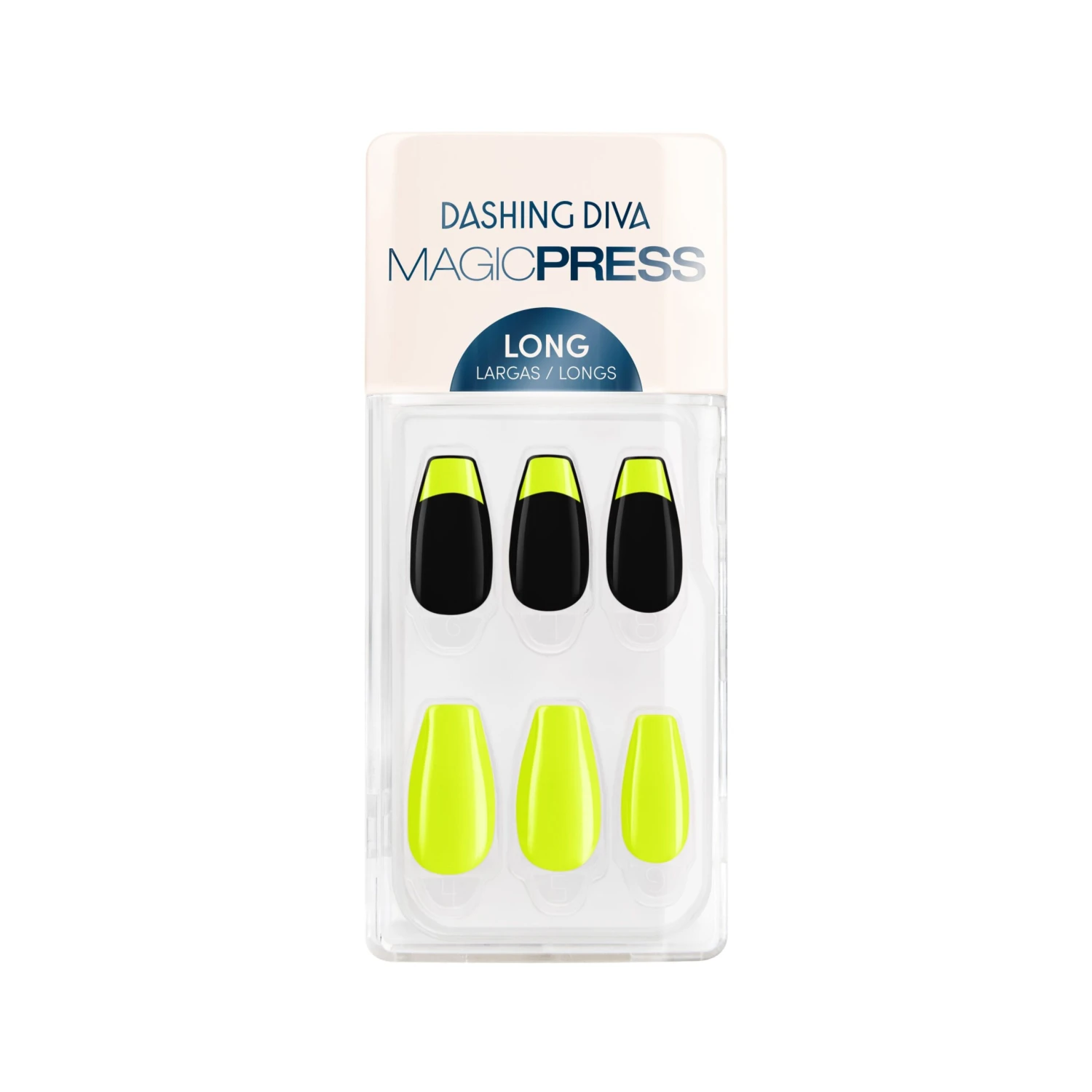 If you’re looking for a next-level press-on manicure, black, neon, and coffin shape make a victorious team. The game is now over. Long length, coffin shape, glossy finish black & neon yellow press-on gel nails featuring neon yellow French tips.