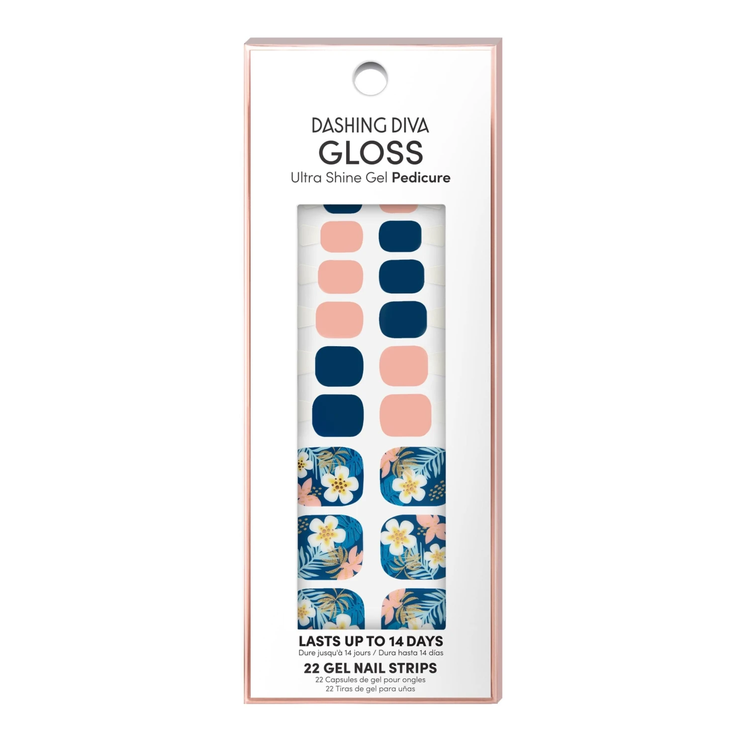 Peach & navy pedicure strips featuring tropical Hawaiian designs with a glossy, high-shine finish.