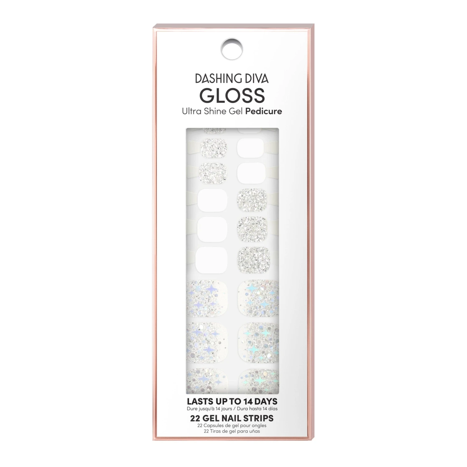 Clear pedicure strips featuring silver & confetti glitter with a glossy, high-shine finish.