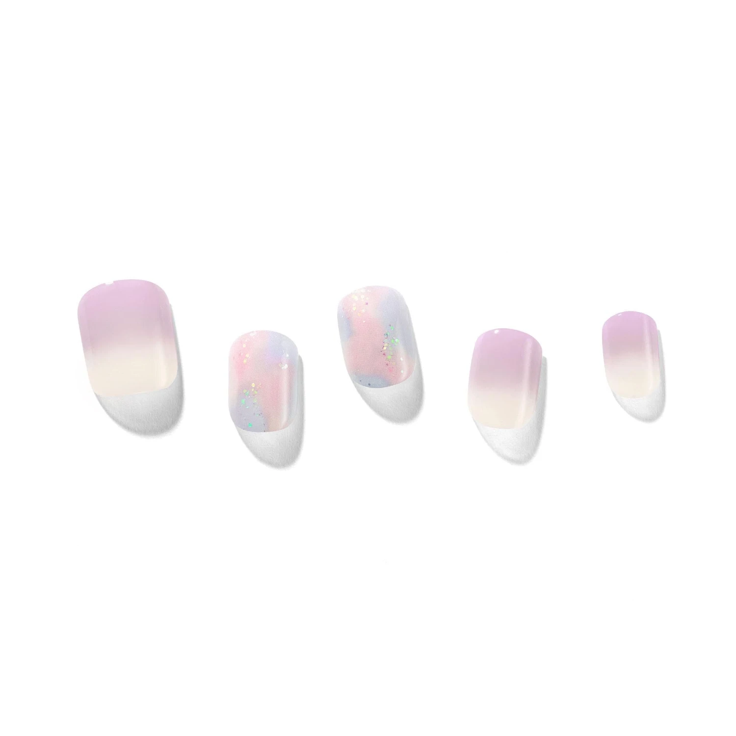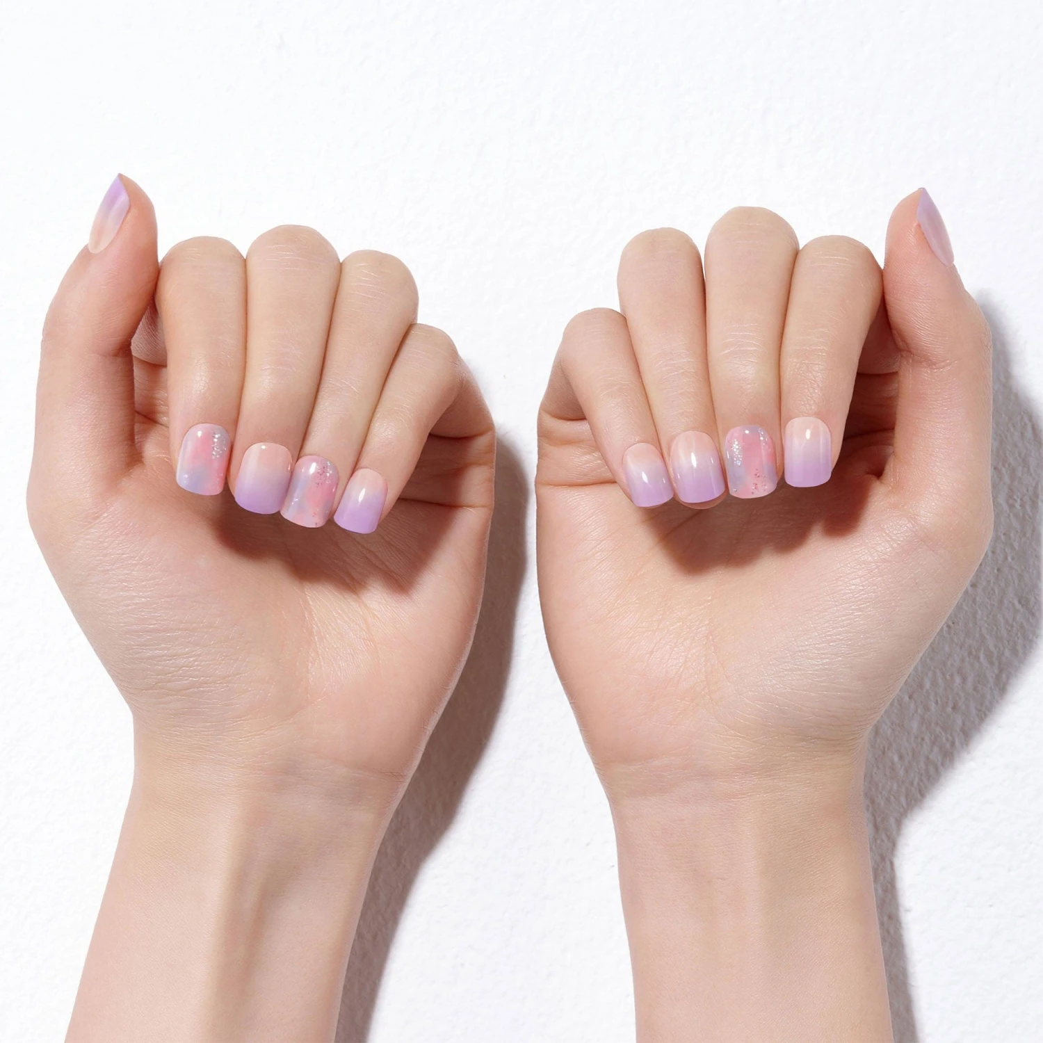 Short length, square shape, glossy finish press-on nails. Find Inner Peace with this soft purple, pink and nude nail look with an ombré effect.