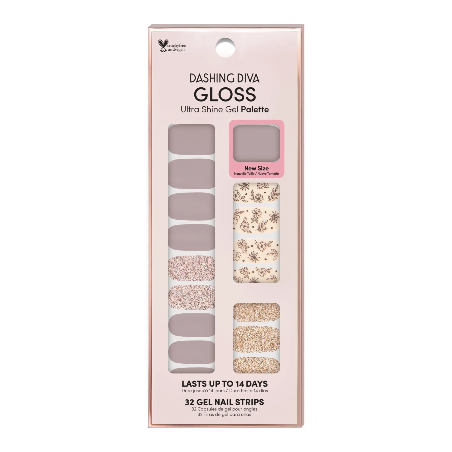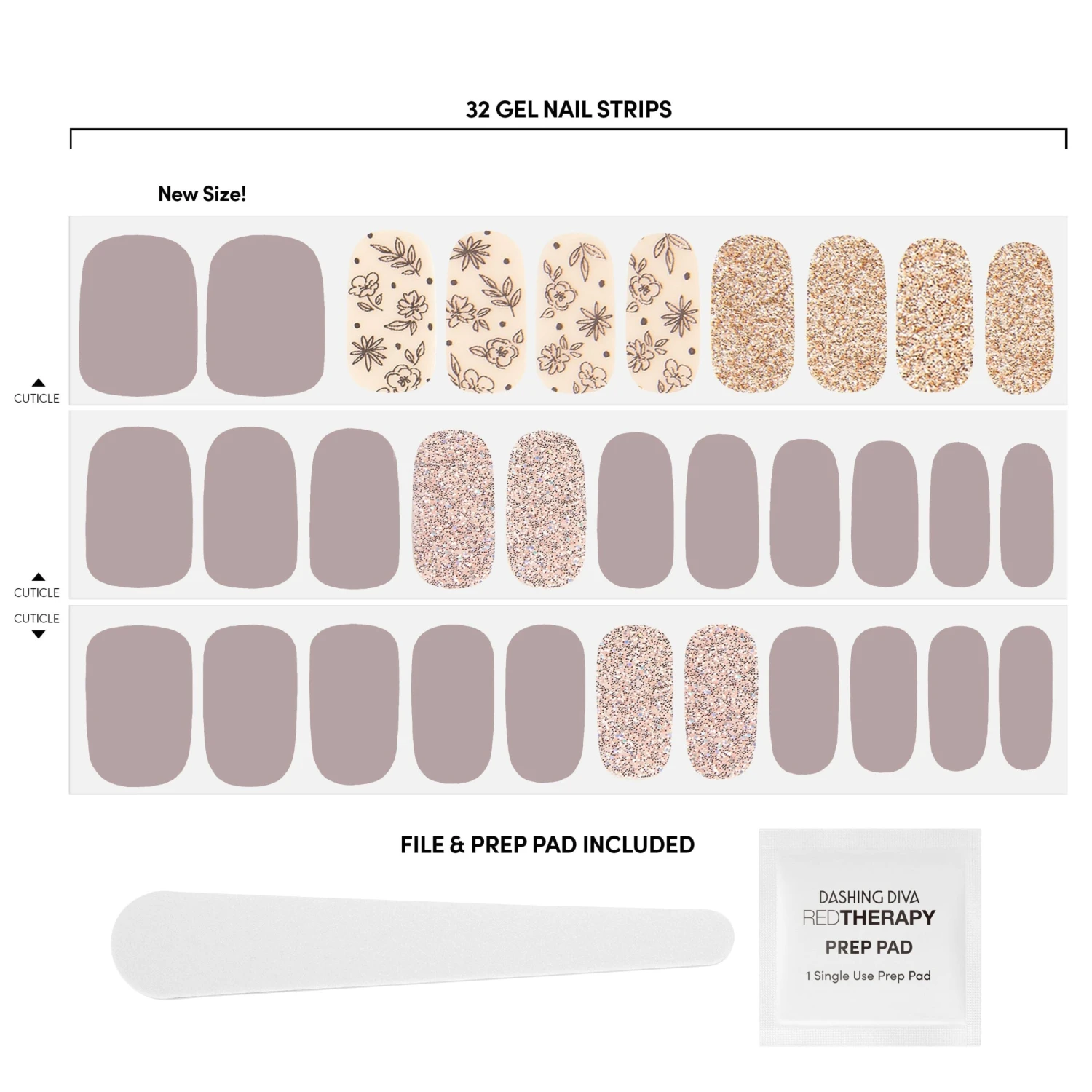 Gray-lavender & ivory gel nail strips featuring gold glitter, rose gold glitter, and foil flower accents with a glossy, high-shine finish.