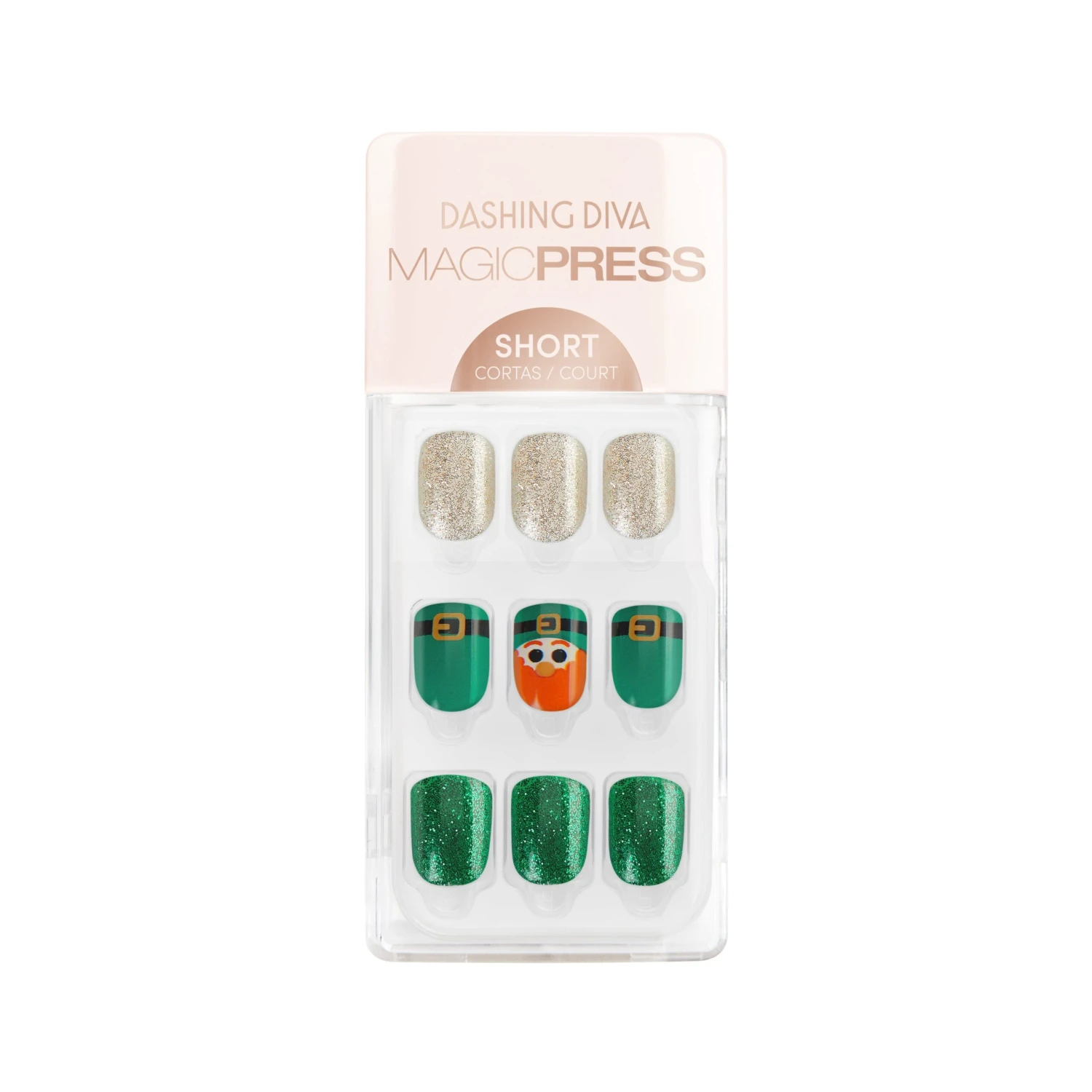 Short length, square shape, glossy finish press-on gel nails featuring green & champagne glitter, leprechaun icons, and belt buckle details.