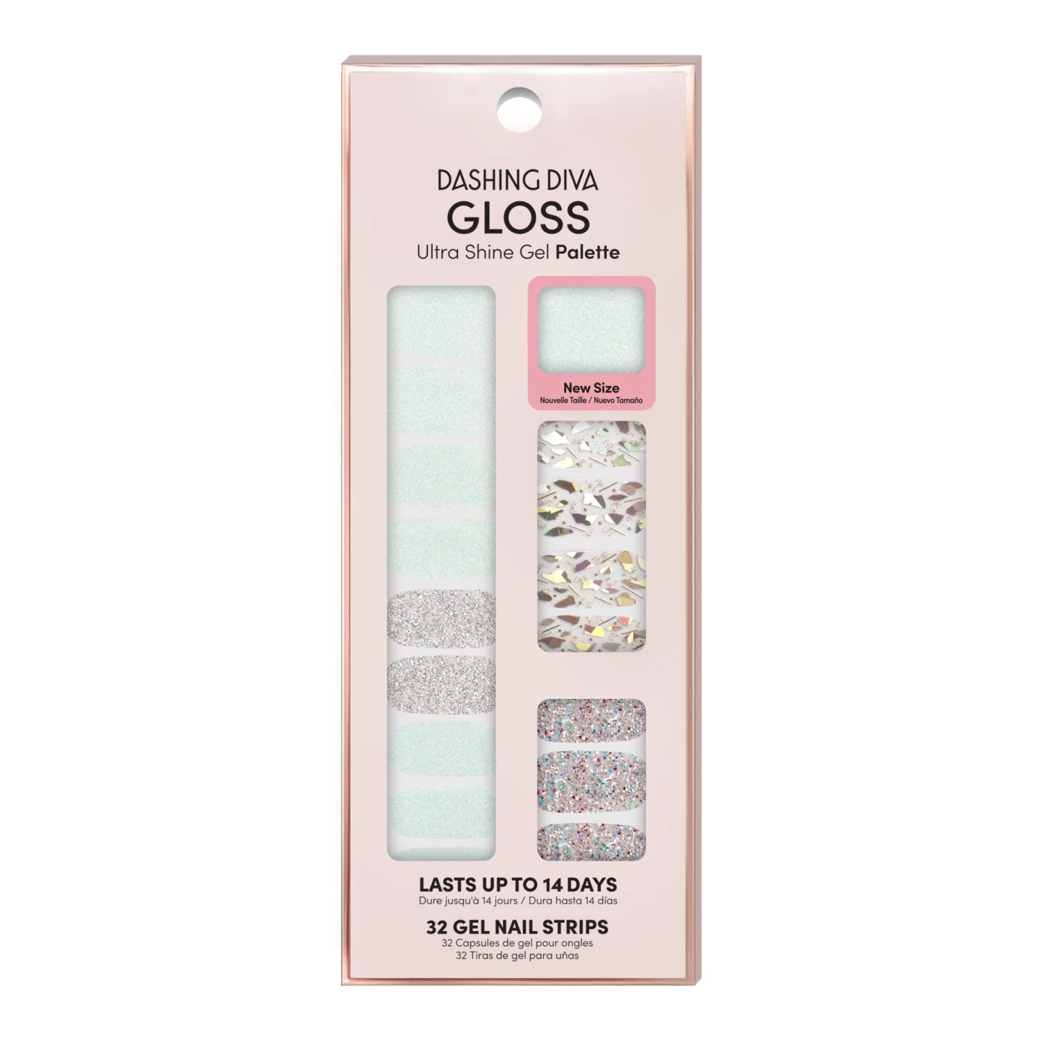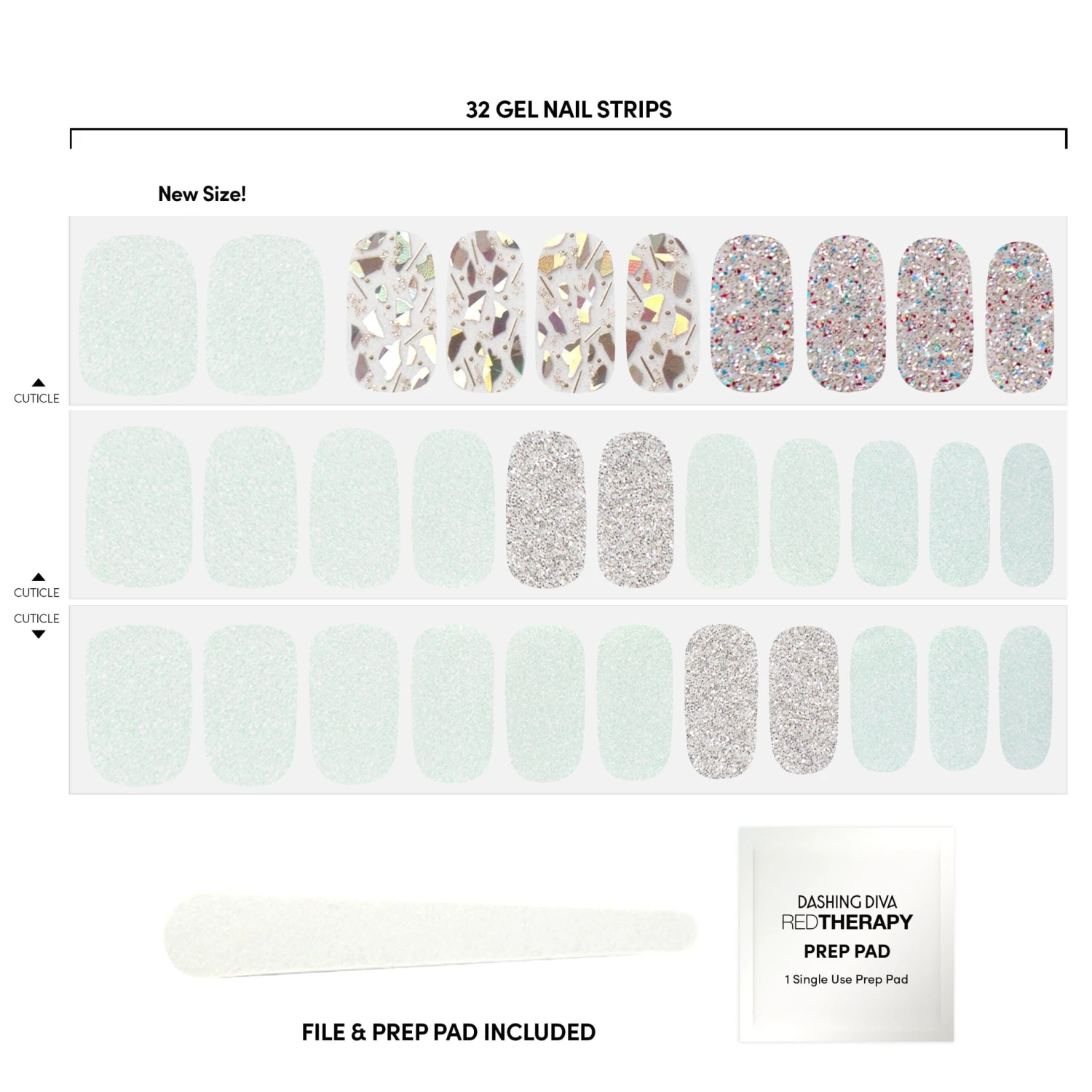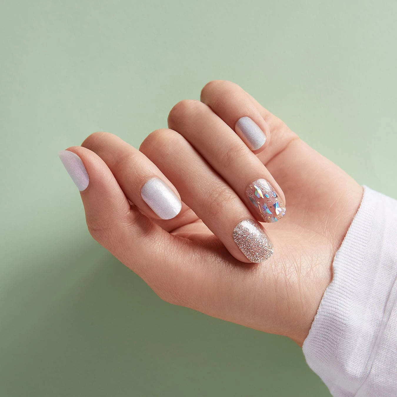 Opal glitter nail strips featuring silver glitter, multicolor glitter, and shattered glass accents.