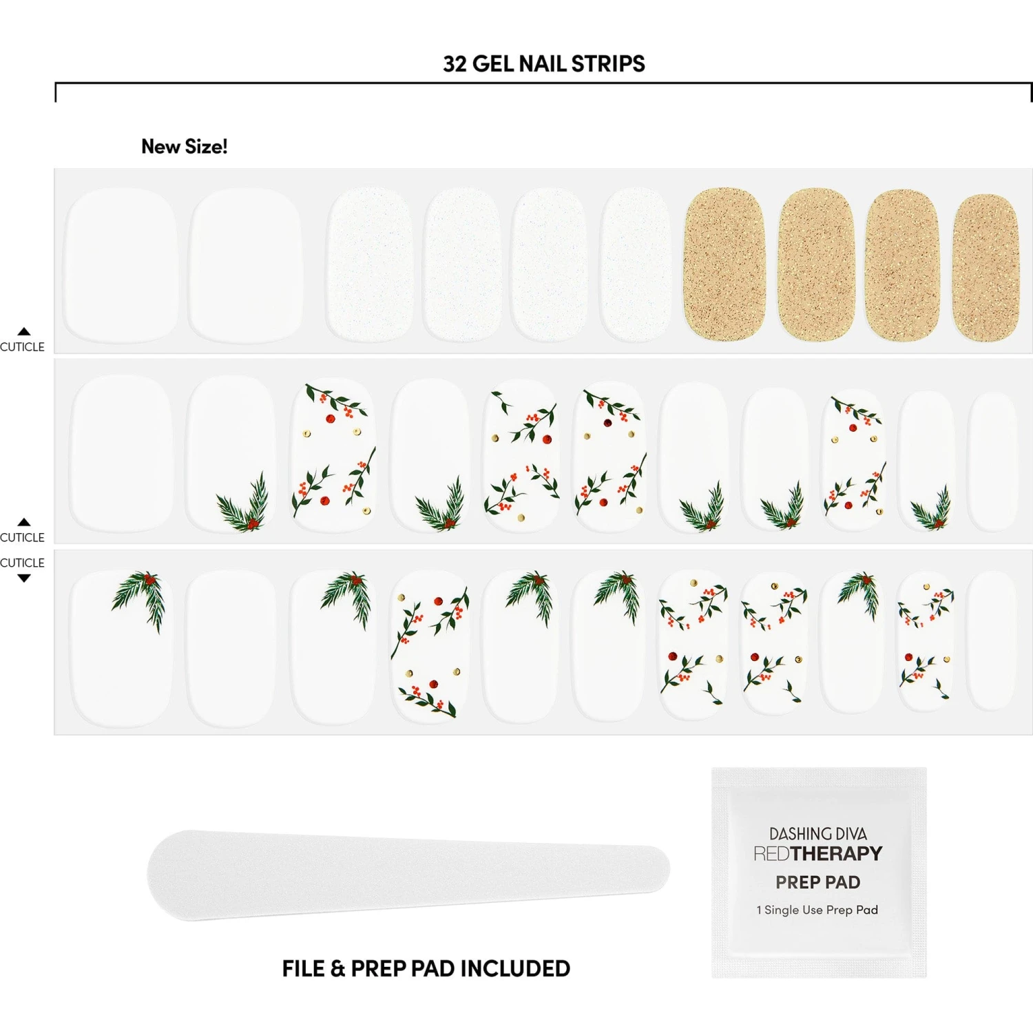 The mistletoe makes the rules. Semi-sheer white nail strips featuring gold glitter, iridescent glitter, red & gold foil details, and mistletoe accents with a glossy, high-shine finish.