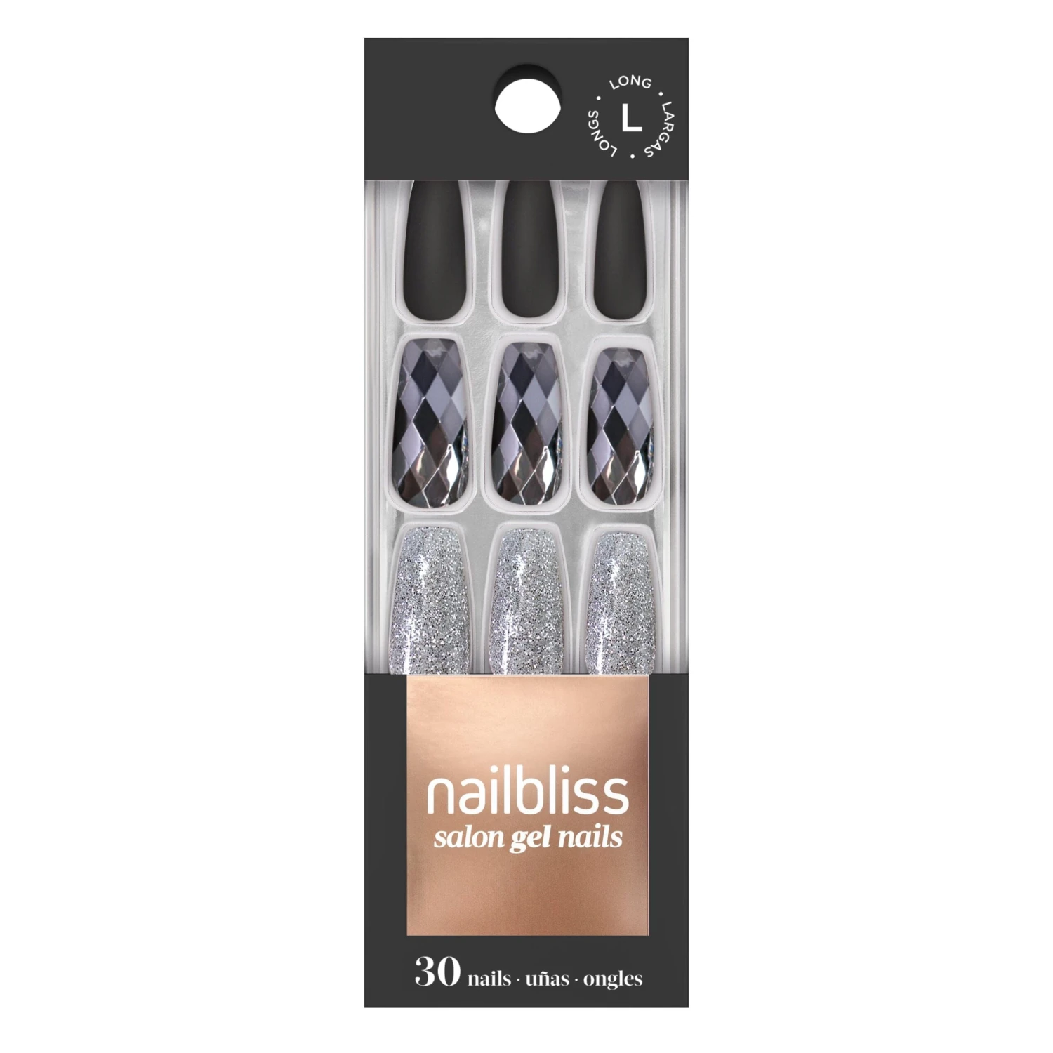 A bold, matte black base with a chrome faceted design and silver glitter will have you shining like an Obsidian Diamond.