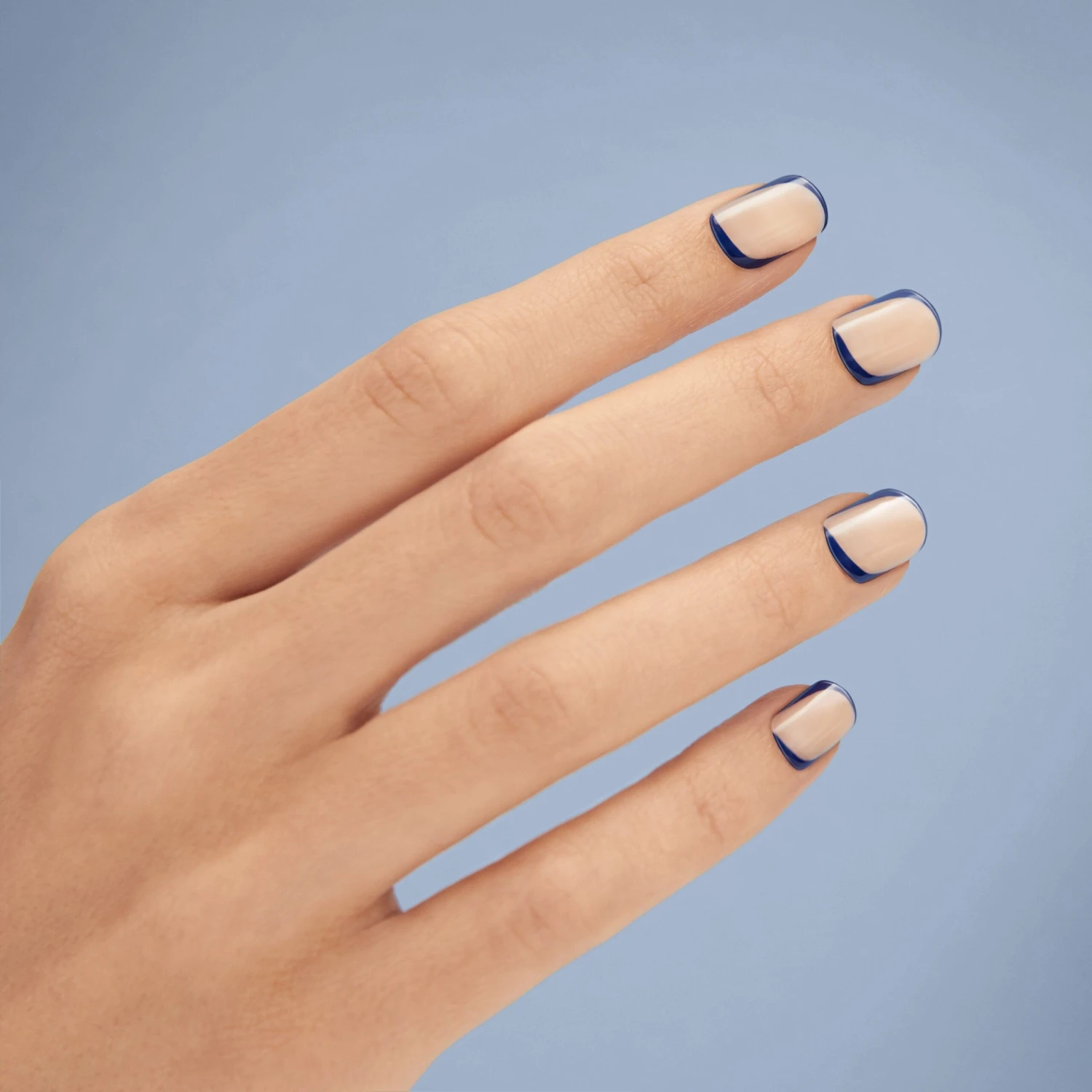 Medium length, square shape, glossy finish press-on gel nails. Be careful you don’t go Off the Edge with these electrifying nails, featuring a cobalt blue edge design.
