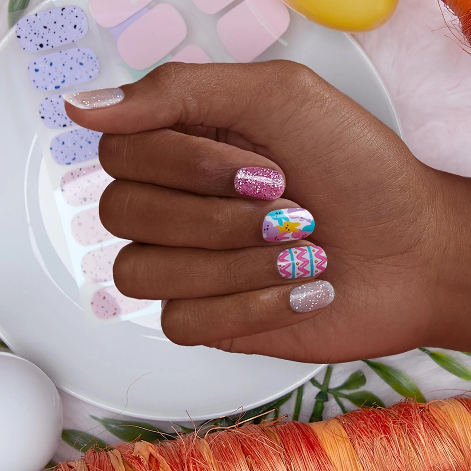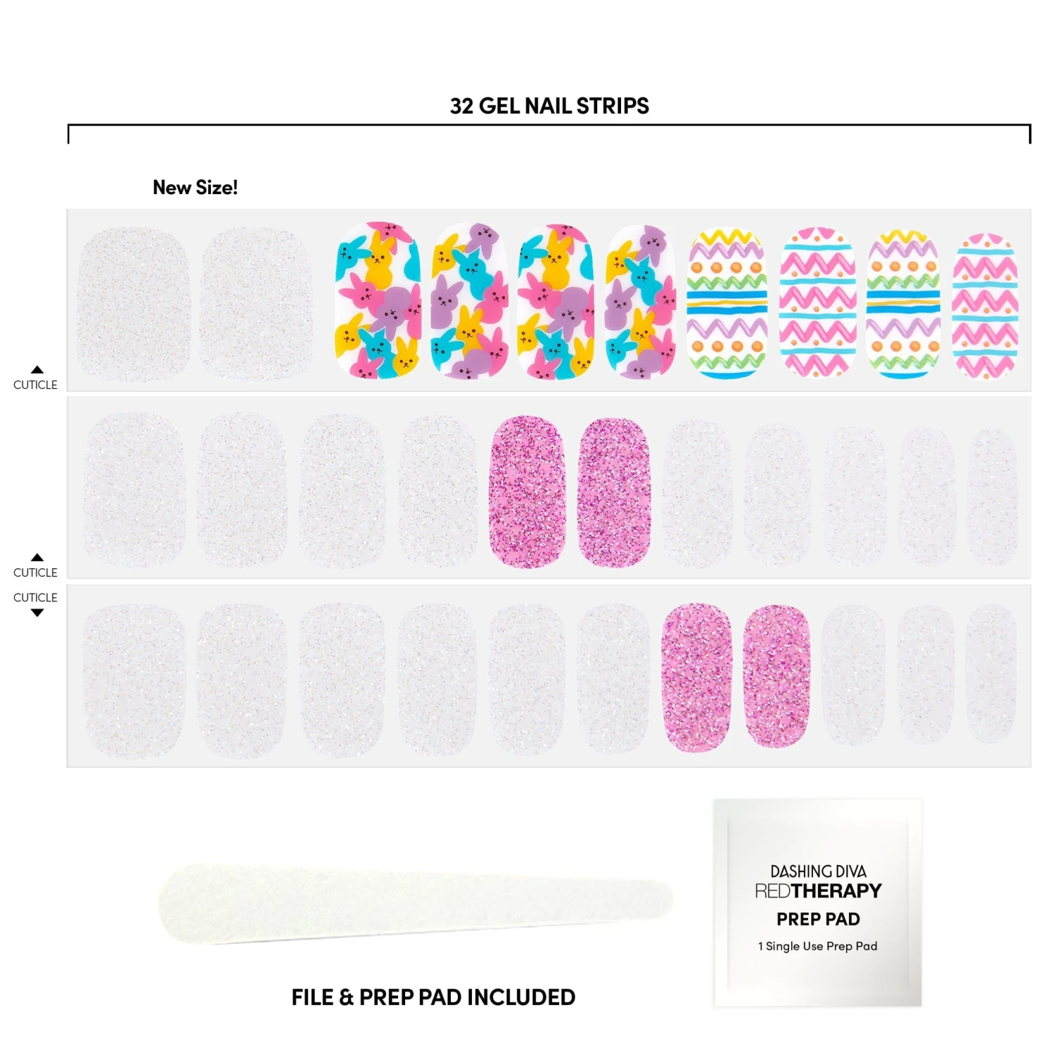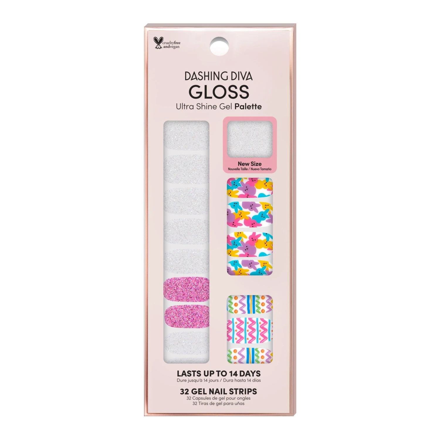 A sweet little addition to any glam-filled Easter basket. Glittered pink & iridescent white gel nail strips featuring 3D Easter egg line art and multicolored bunny accents with a glossy, high-shine finish.