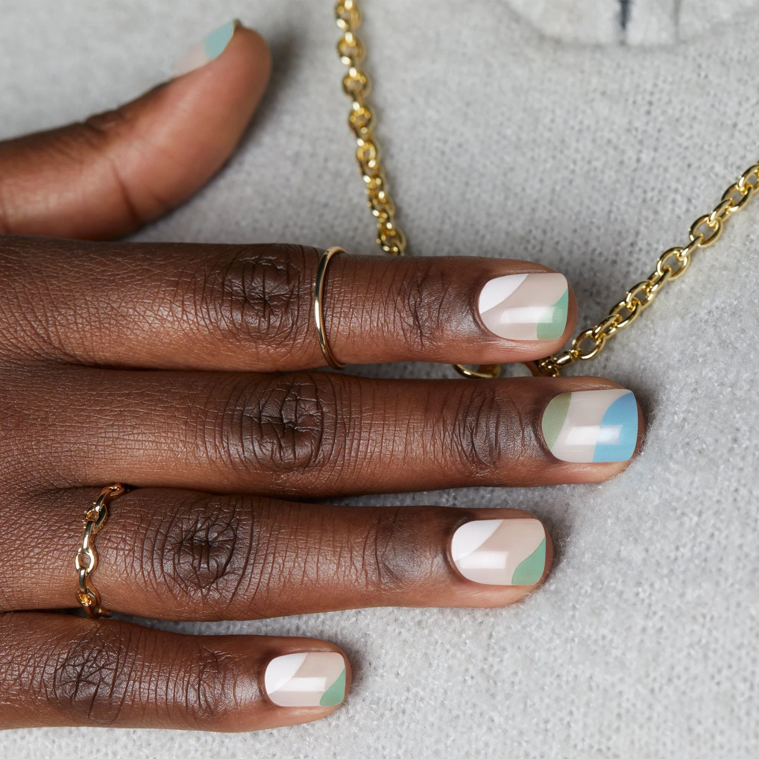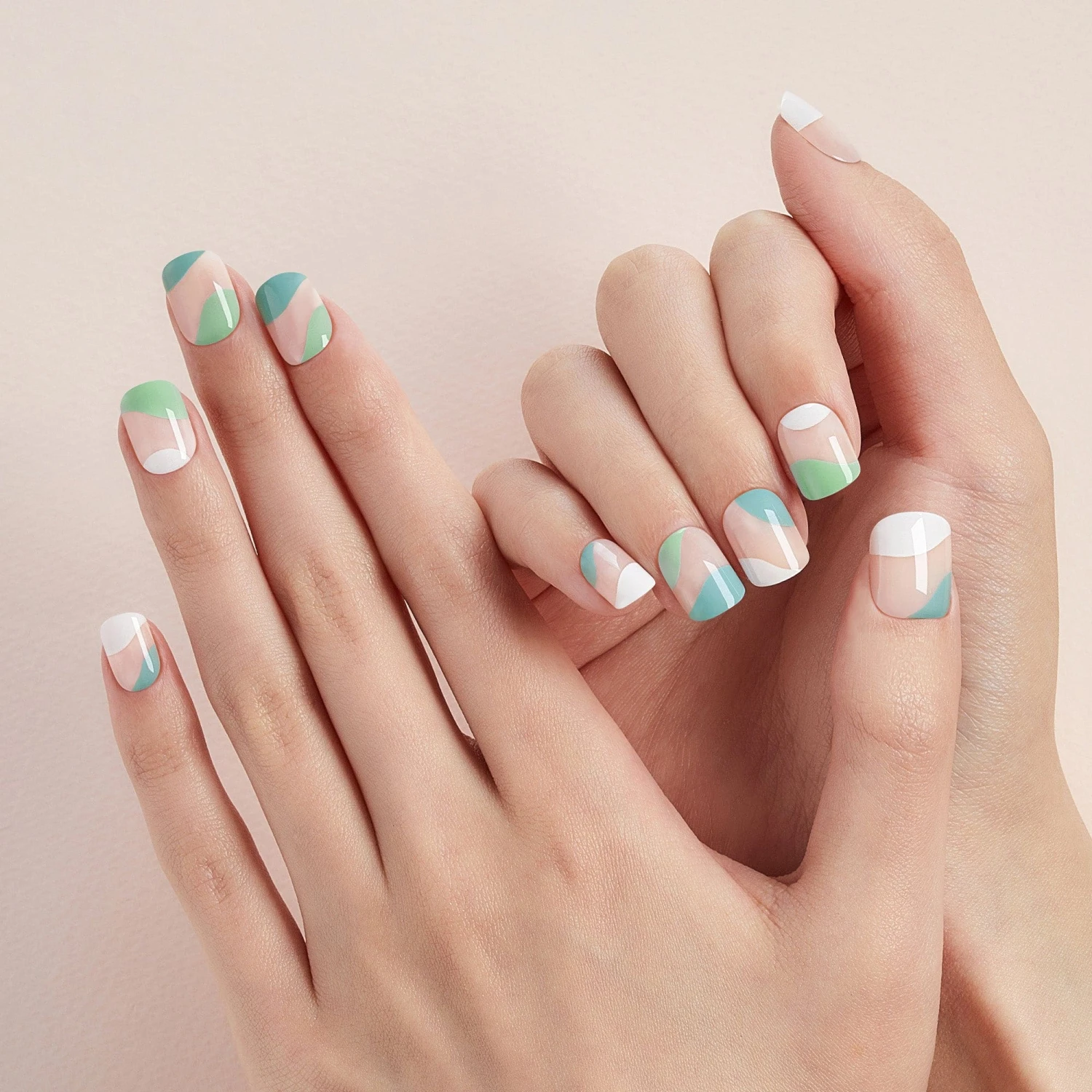Short length, square shape, glossy finish nude press-on gel nails featuring negative space & turquoise, mint, and white abstract color waves.