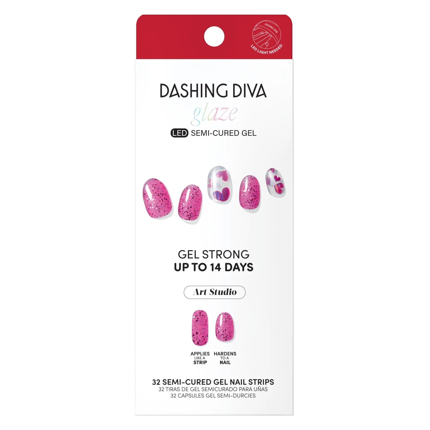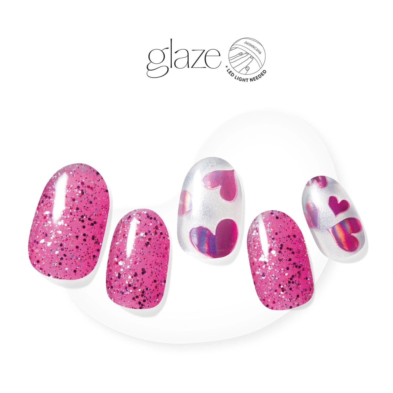 A full-blown love affair with me, myself, and I. Semi-cured pink gel nail strips featuring iridescent glitter and holographic hearts with mega volume & maximum shine.