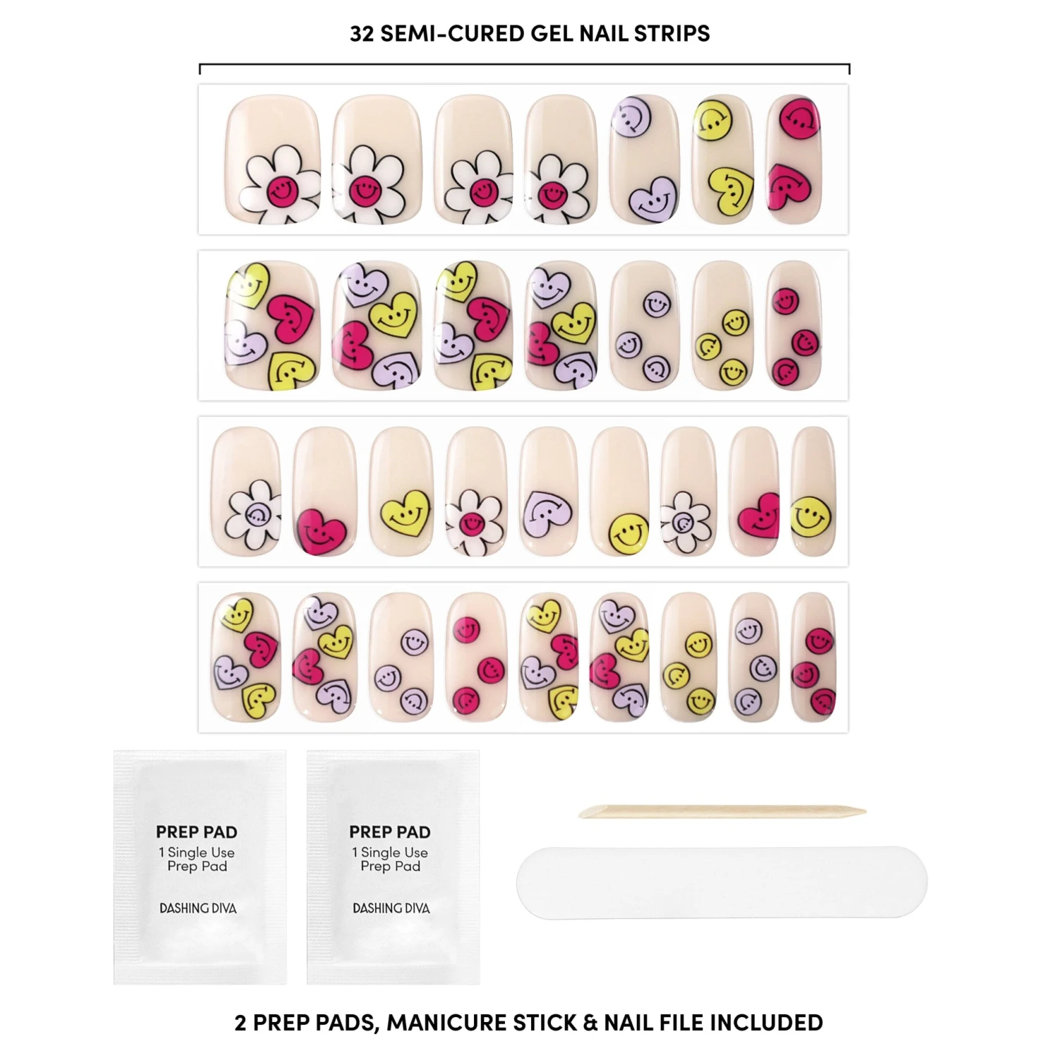 Semi-cured clear gel nail strips featuring retro multi-mani nail art done by Noelle Moore. Nail art includes hearts, flowers, and smiley face icons with mega volume & maximum shine.