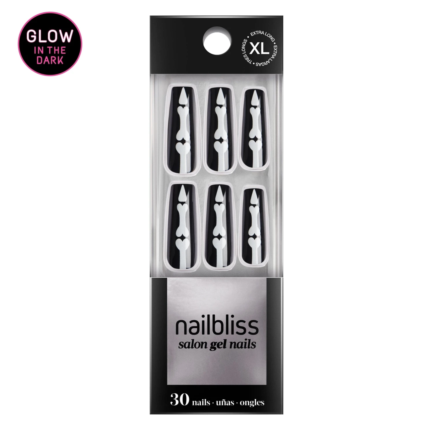 Extra long length, coffin shape, glossy finish. Black glue-on gel nails featuring skeleton bone accents.