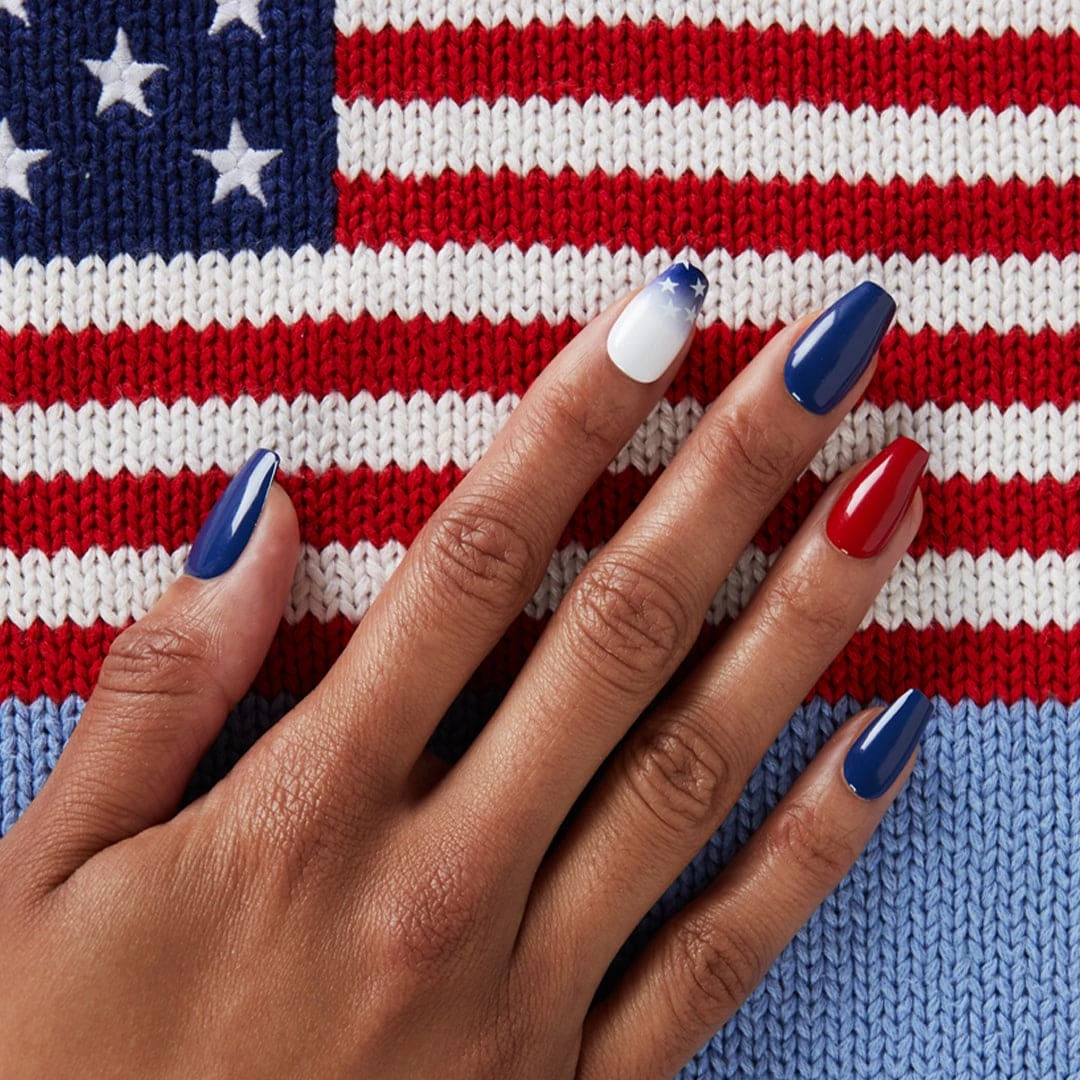 Long length, coffin shape, glossy finish press-on gel nails. A traditional American flag manicure featuring ombré stars, red-stripe red, and old glory blue – United we glam!