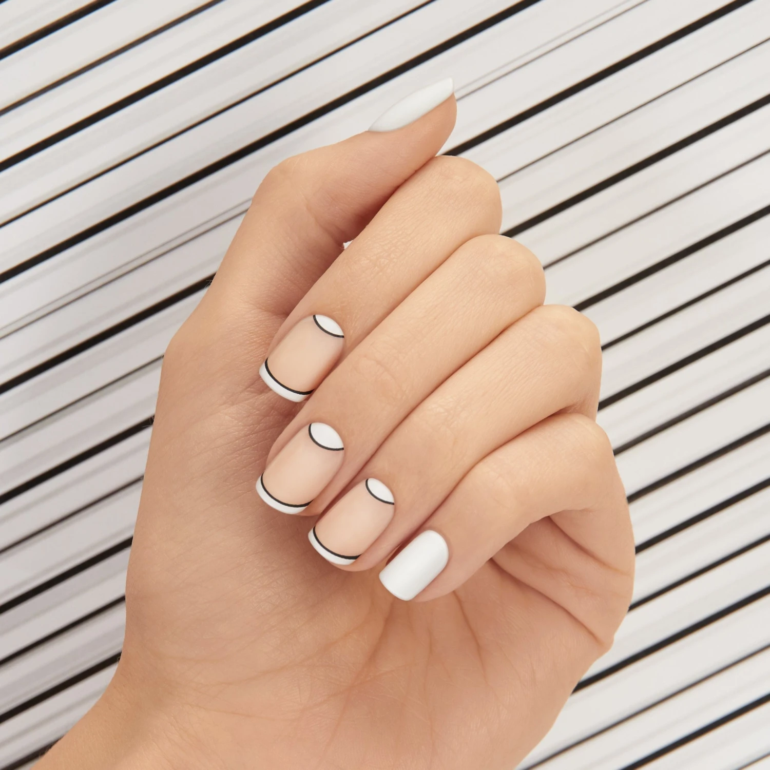 Medium length, square shape, matte finish white press-on gel nails featuring a milky nude base, a reserve French tip design, and black accents.
