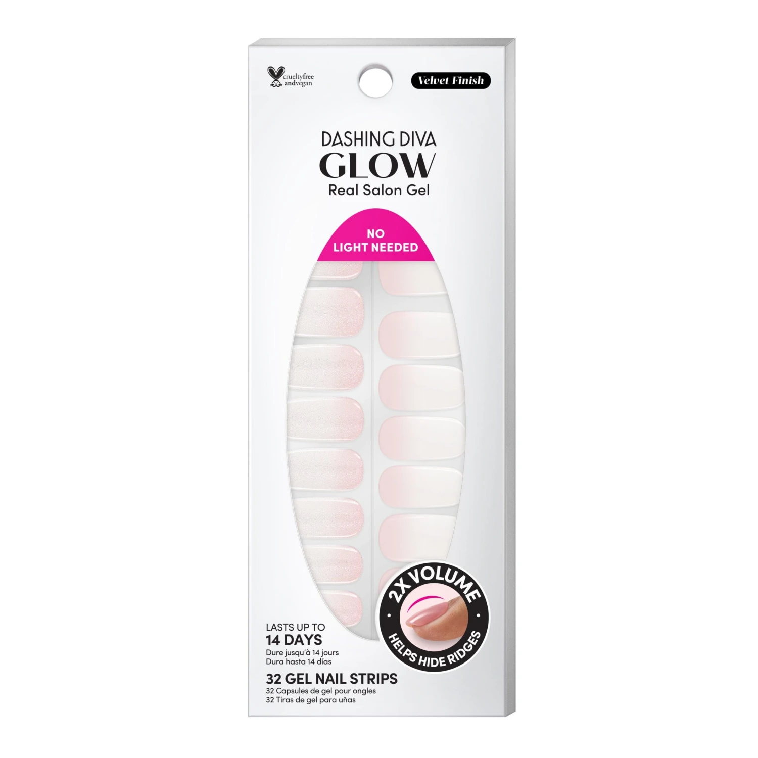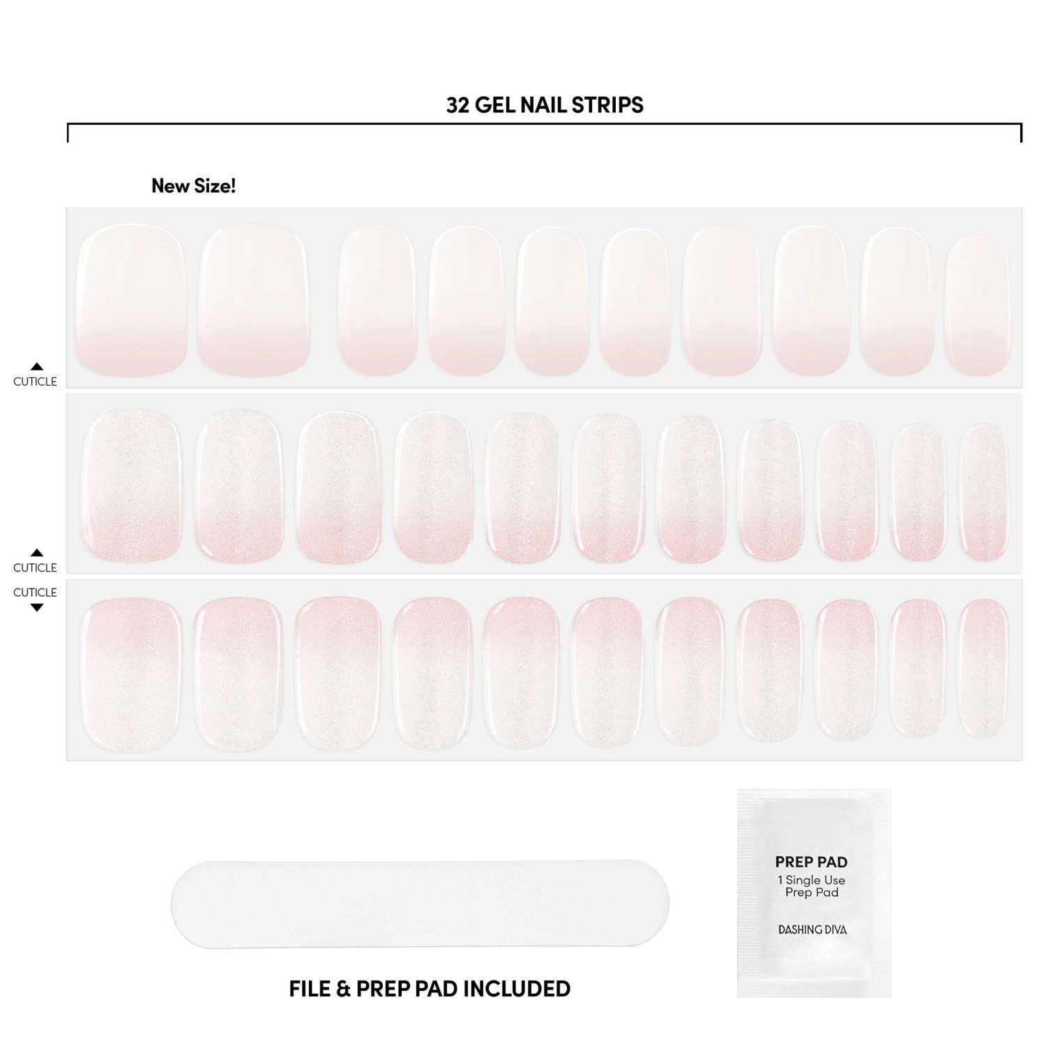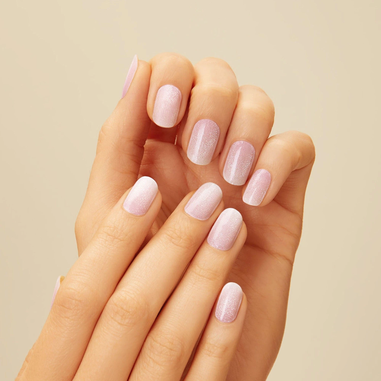 White to pink ombré gel nail strips featuring velvet shimmer with a double gel formula for an ultra-smooth finish.