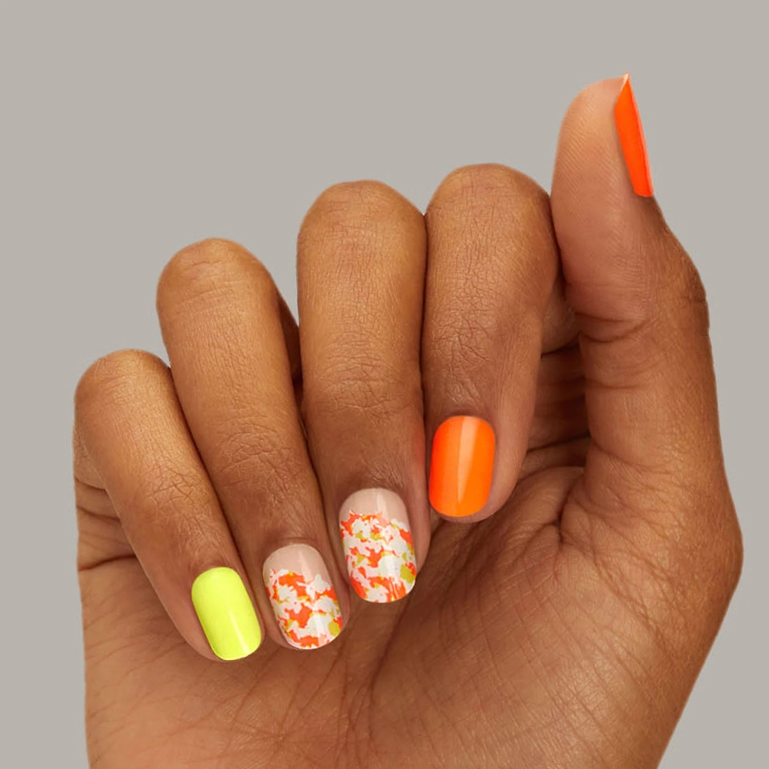 Neon orange & neon yellow nail strips featuring camouflage accents with a glossy, high-shine finish.