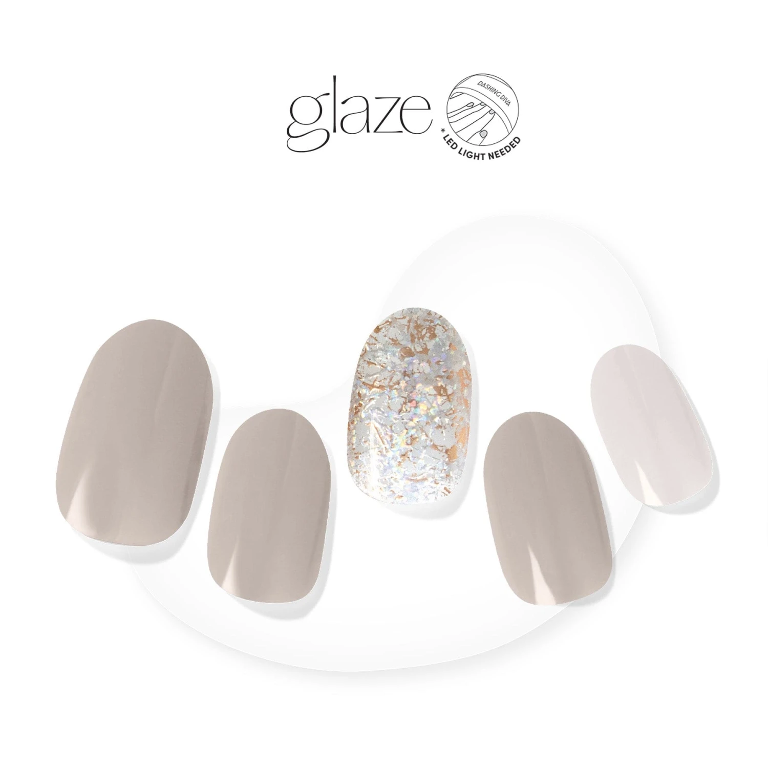 Semi-cured shades of gray & clear gel nail strips featuring bronze and iridescent foil accents with mega volume & maximum shine.