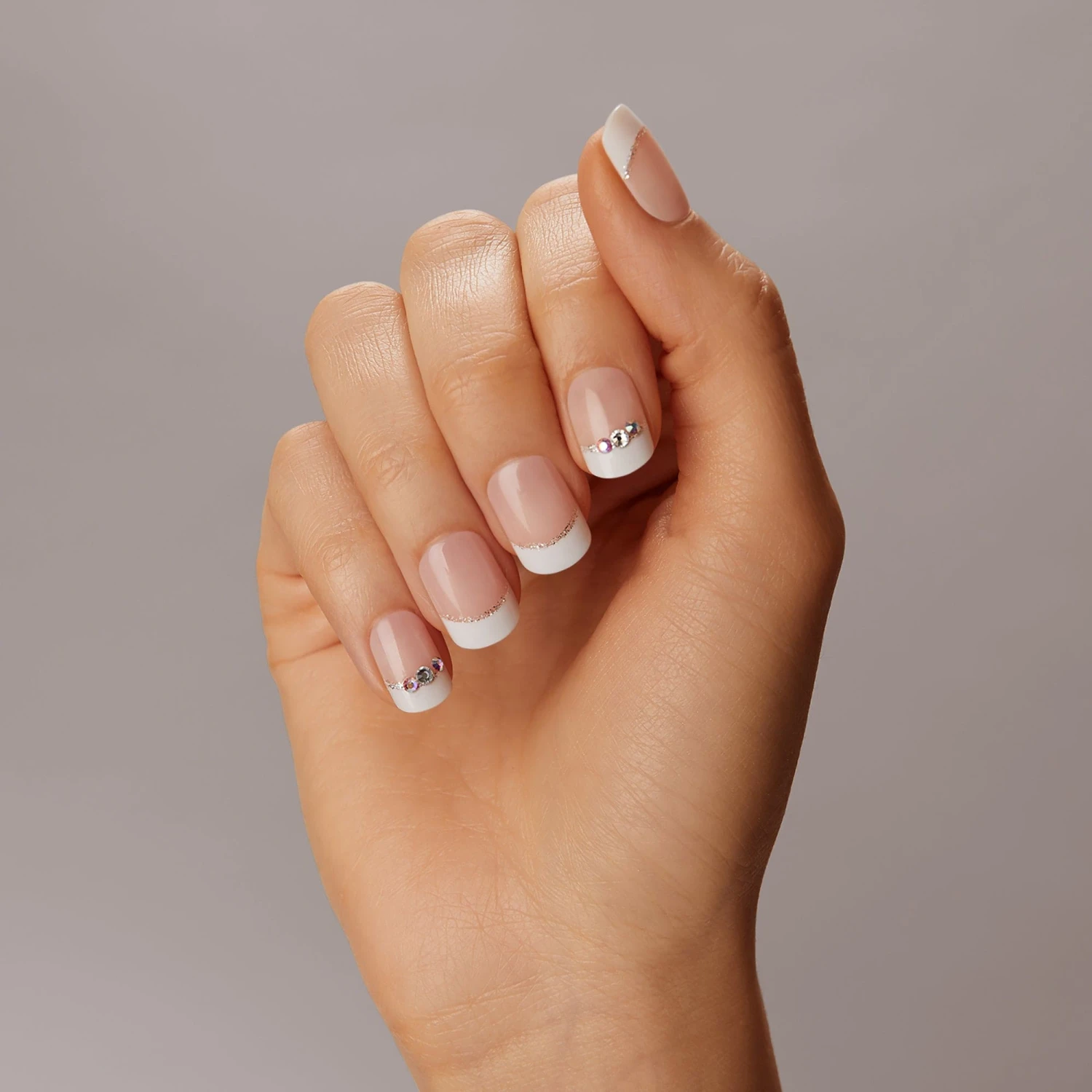 Medium length, square shape, glossy finish. Semi-sheer nude press-on gel nails featuring white french tips with rhinestones and silver foil detailing.