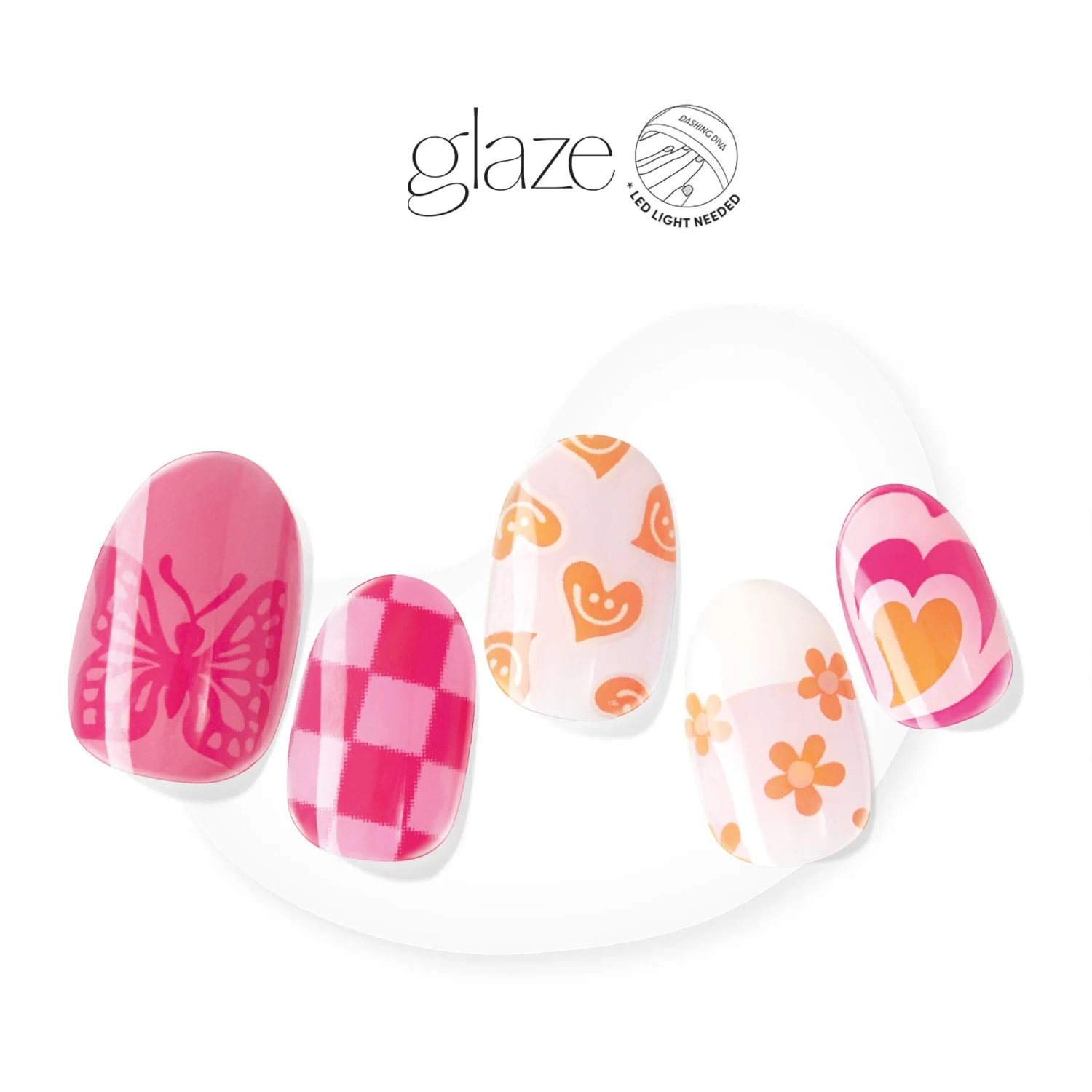 Semi-cured pink, orange, and clear gel nail strips featuring retro multi-mani nail art done by Noelle Moore. Nail art includes french tips, flowers, butterflies, and checker print with mega volume & maximum shine.