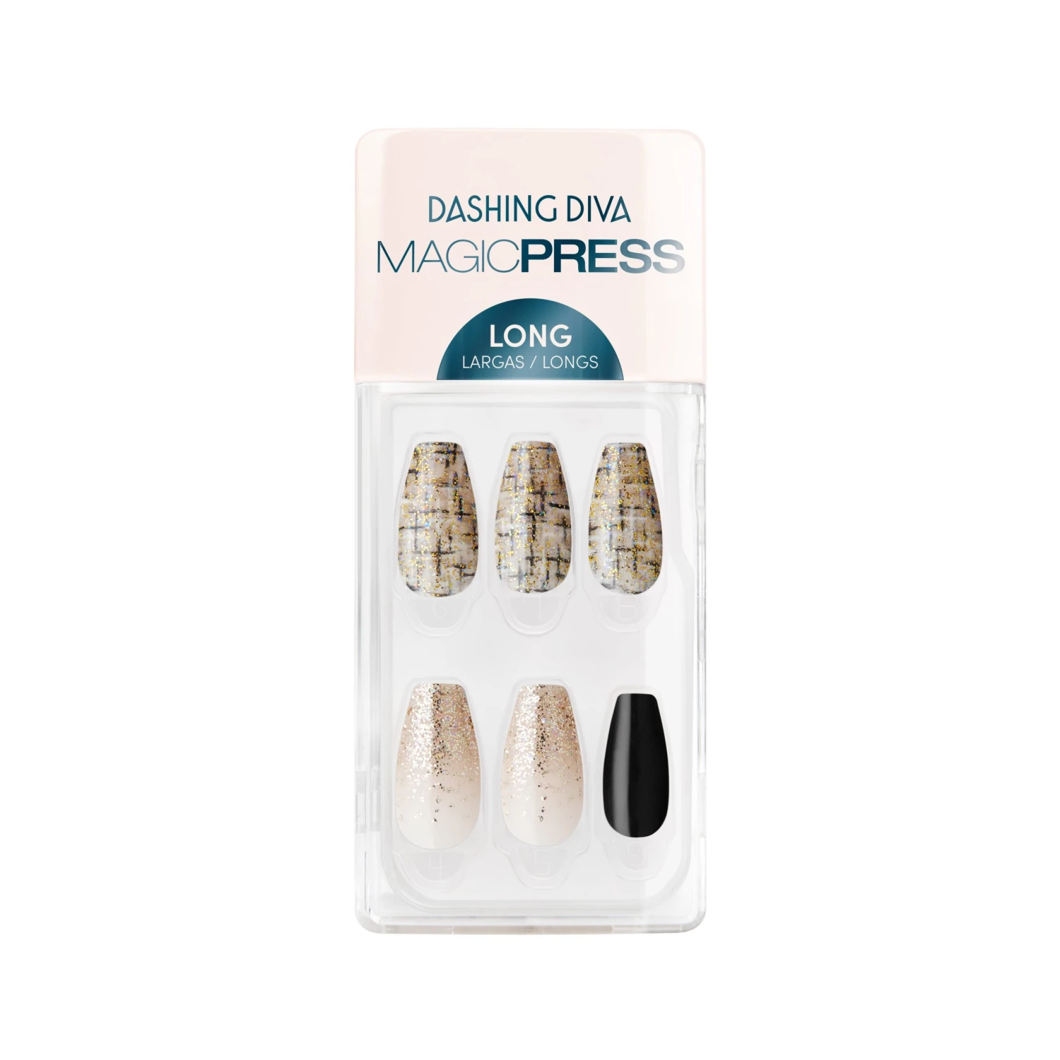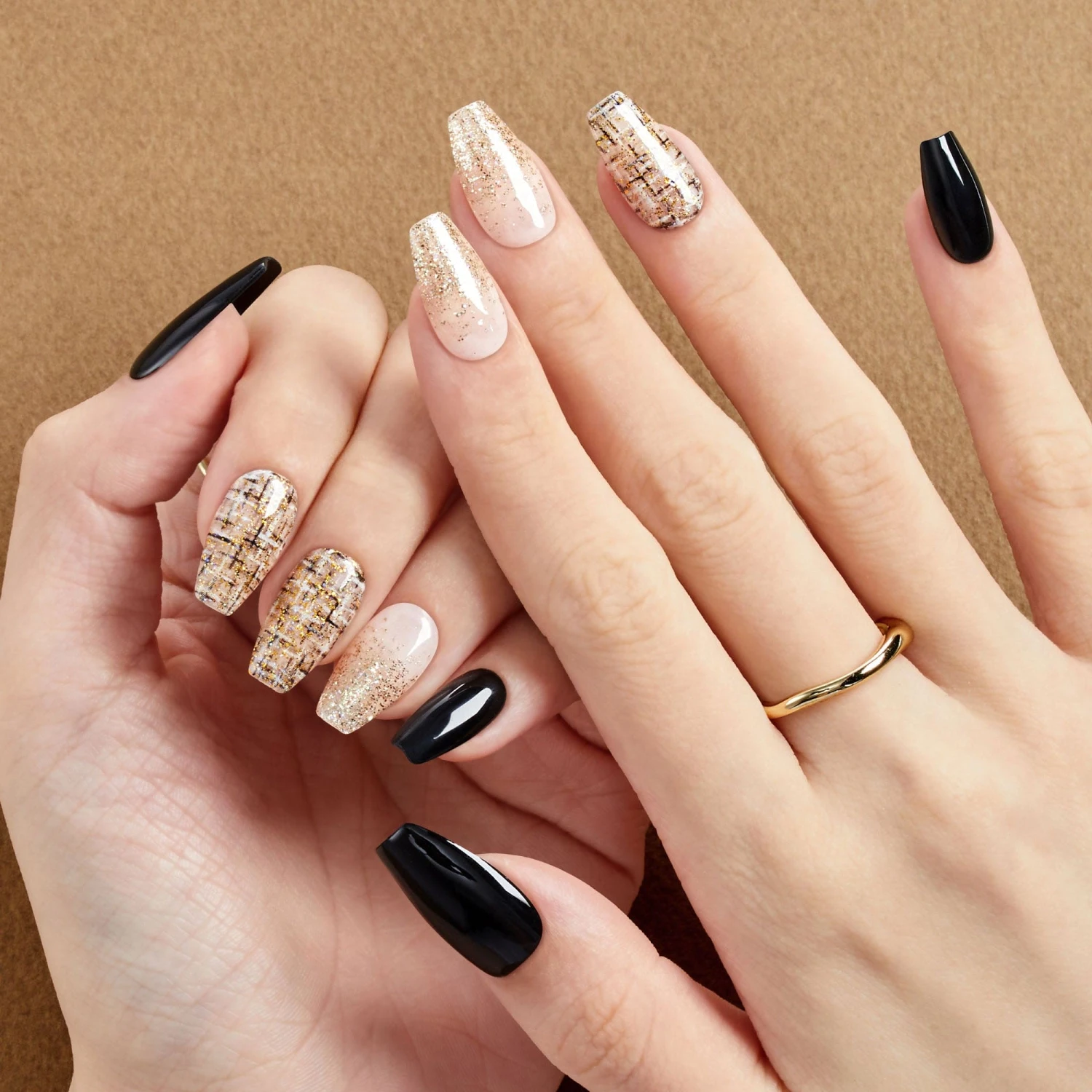 Can you match my tweed energy? Long length, coffin shape, glossy finish black press-on gel nails featuring golden glitter and iridescent tweed detailing.