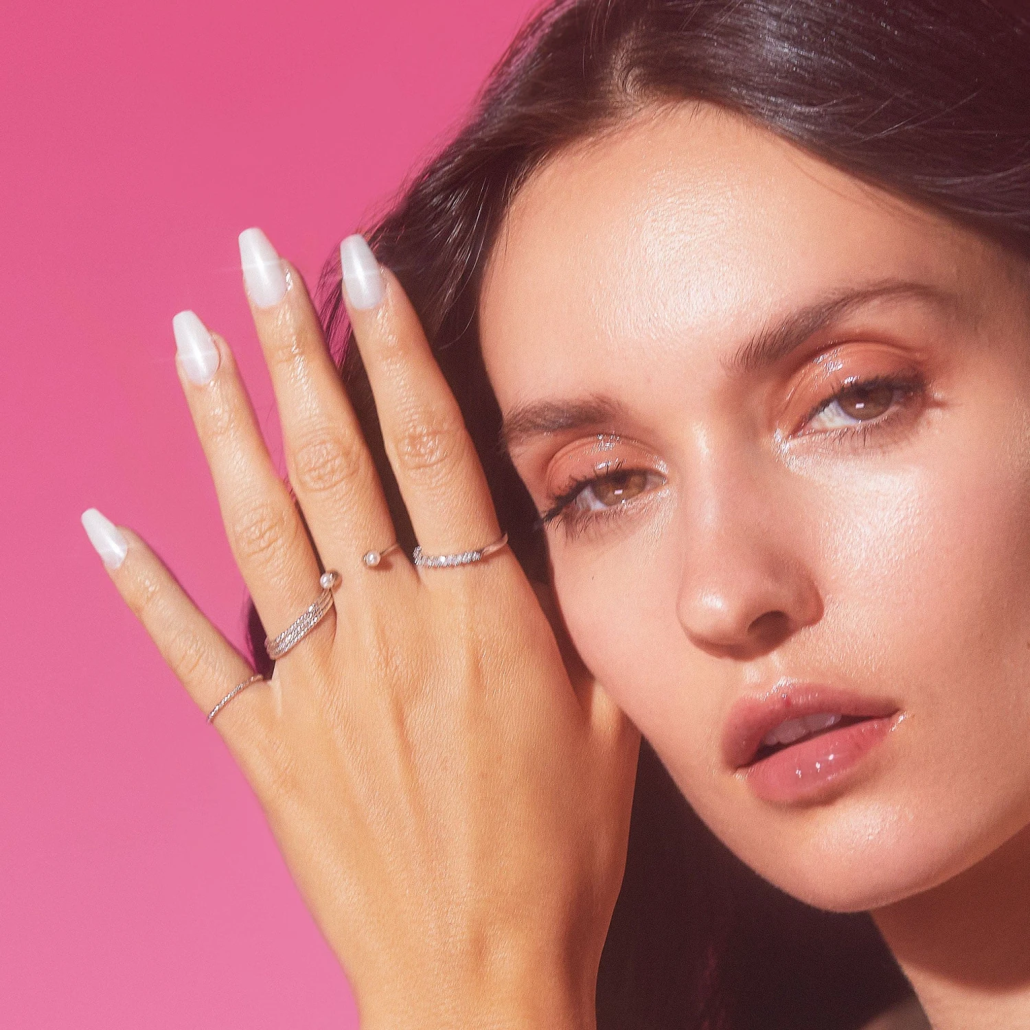 White press-on gel nails featuring, long length, coffin shape, and a shimmery chrome finish.